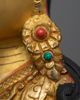 The statue, expertly fashioned from a copper body, is both durable and artistically beautiful. It is embellished with a rich 24K gold gilding, which adds magnificent shine and elegance. The statue is enhanced by intricate gold and acrylic paintings highlighting Guru Rinpoche's tranquil demeanor and symbolic features, such as the vajra and skull cup.