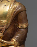 This magnificent statue (Gambar) of the beloved Buddha Amitabha portrays every facet of the deity's compassion and peacefulness. It's a work that inspires dedication and amazement, standing 8.2 inches tall. The statue has a 5.5-inch oxidized copper base and the ethereal glow of 24k gold gilding, which is enhanced with precisely hand-painted acrylic embellishments. The combination of materials and craftsmanship creates the personification of unlimited compassion and infinite wisdom.