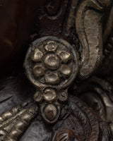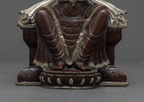 Hand-crafted with intricate details, silver plated on a copper body. This beautiful Buddha Maitreya Statue is a one-of-a-kind addition to any spiritual collection that will last a lifetime. Our master artisans have meticulously crafted it, making it ideal for those seeking a powerful connection to the divine Buddha of the Future. Buddha is shown seated on a magnificent throne, his hands are in Dharmachakra Mudra near his heart, and a lotus flower is beside his both shoulders.