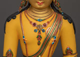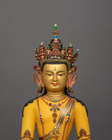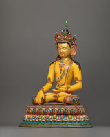 This Mitrugpa for shrine statue, crafted from copper and embellished with 24K gold gilding, is a Buddhist art hand-carved Buddha statue in the traditional Himalayan style.