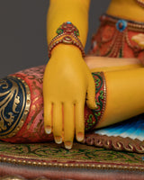 Mitrugpa is depicted in the lap with his left hand's palm upturned in the meditation gesture. A vajra scepter is typically held upright on the point with the point balanced on the palm. Mitrugpa's vajra scepter represents him as the symbolic Buddha of Tantric Buddhism's Vajra Family. Tantric deities are organized according to these five classifications proposed by the tantric theory.