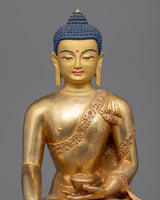 This stunning handmade Buddha Shakyamuni statue Seated in Meditation was created in our studio with the utmost care and precision. The statue depicts Buddha Shakyamuni with his hands resting in his lap, holding an alms bowl, and his other hand on earth touching mudra, symbolizing his enlightenment and wisdom. Buddha Shakyamuni is revered as the founder of Buddhism and represents his compassion and wisdom teachings. The intricate detailing and lifelike features are a testament to our Nepalese artisans' exceptional skills, passed down to us from generation old sculpting masters. this was molded on a copper body and then gilded in genuine 24k gold.