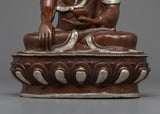 The Buddha Shakyamuni statue is an intricately handcrafted piece produced in our studio and designed with unique Nepali motifs. The Buddha is depicted seated on a moon disc lotus and holds an alms bowl in his right hand while portraying the 'Bhumisparsa Mudra,’ representing the Buddha's awakening as he claimed the earth as his witness. This piece is hand-carved out of copper and partially gilded in gold and silver with acrylic painting done over it.