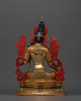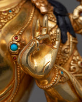 The Buddhist Goddess Green Tara Sculpture, stands at a height of 12.4 inches (31.5 cm) and has a base width of 8.3 inches (21 cm). This statue is adorned with intricate 24K gold gilding, enhancing the figure's fine details and beauty. The statue is further enriched with gold and acrylic paintings, adding vibrant colors to bring out the divine energy of Green Tara. Hand-carved gemstones are incorporated into the design, elevating the piece's unique beauty and spiritual significance.