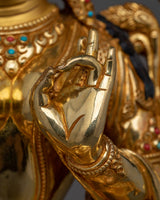 Jetsun Dolma Green Tara Sculpture statue, measuring 13.4" (Height) x 11.2" (Base) and weighing 4.16 kg, is crafted of copper, gilded in 24K gold, and adorned with gold and acrylic paints. It is created by talented Nepalese artisans, and reflects the spiritual depth and creative traditions of the Himalayas, making it an appropriate centerpiece for altars, temples, or sacred areas.