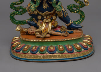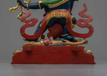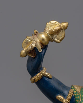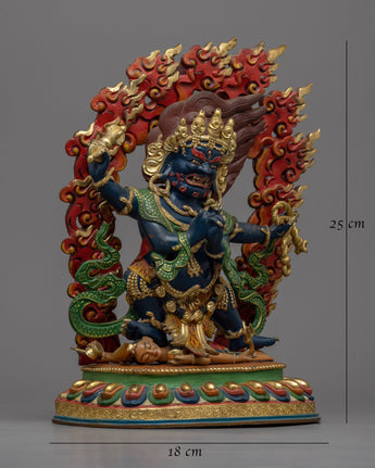 Discover the grand majesty of our Butadamara Vajrapani Statue, which was skillfully created by expert artisans. This statue stands 9.8 inches tall and has a 7.1-inch base. It is made of copper and is adorned with 24K gold gilding and elaborate acrylic paintings. Butadamara Vajrapani, a Buddhist deity who represents force and protects against evil, is shown with furious grace and meticulous detail.
