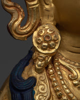 Crafted on a copper alloy and gilded in genuine 24k gold, He sits on a moon disc lotus seat, reflecting his total purity. Two of his four arms are joined in the prayer position, holding the wish-fulfilling gem. In his other left hand, he holds a lotus flower, and in his other right hand, a crystal mala (rosary).