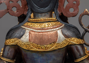 Inheriting the craftsmanship passed on for generations, we have magnificently hand-carved the Chenrezig Avalokitesvara Sculpture. The statue is carved from a copper body, gilded with 24k genuine gold, and finely painted with acrylic paint, which highlights the details of the statue to a greater extent. The deity is depicted with four arms holding rosary beads and a full-blown lotus in the other hand, while his two front hands are in a praying gesture holding a wish-fulfilling crystal in between. The lotus seat, robe, and crown are original designs by the artists of Nepal. The statue features intricate design patterns that took us months and months to hand-carve.