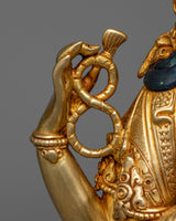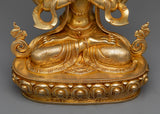 This sculpture is expertly constructed from a high-quality copper body, which was chosen for its durability and historical significance in religious art. The statue is embellished with a lavish 24K gold gilding, which not only adds to its magnificent splendor but also represents Manjushri's enlightened insight. The gold finish highlights the sculpture's delicate intricacies, creating a stunning work of spiritual art.