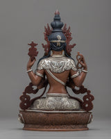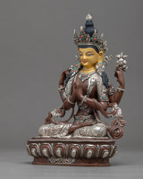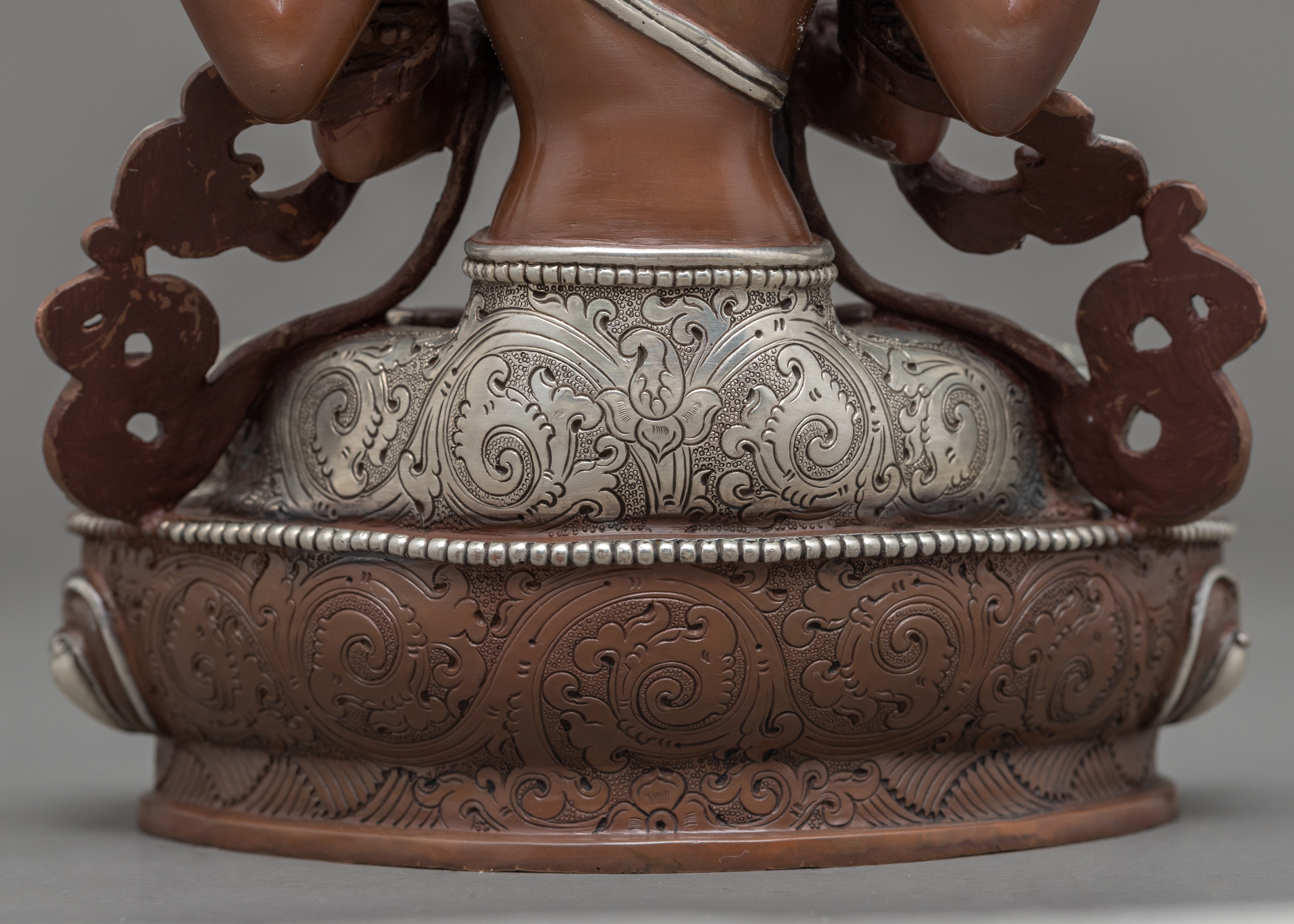 The Buddhist Chenrezig sculpture was meticulously hand-carved by us in Nepal, embracing traditional Himalayan art. We symbolize the Buddhist art of the Kathmandu Valley, whose artisan has passed from generation to generation. A deity with a serene expression portrayed seated on a moon disc lotus seat is expressively mesmerizing. We have adorned the crown with precious turquoise and corals, which illuminates his face. We exquisitely hand-crafted the statue in an oxidized copper body, plated with silver and gilded face with genuine 24 karat gold. This Tibetan statue can be used in a multitude of Vajrayana rituals as well as in everyday yoga or meditation practices.