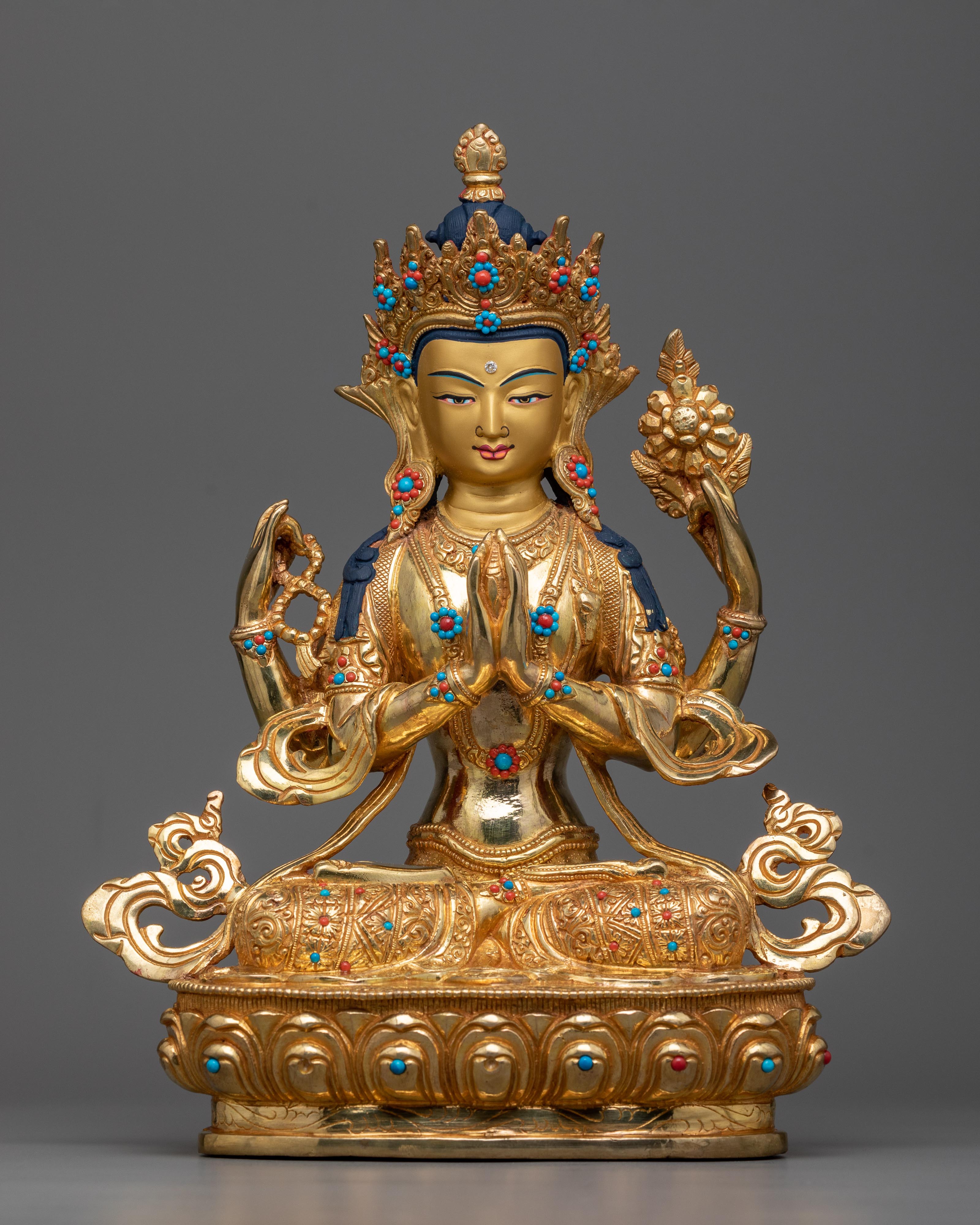 This exclusive Chenrezig Handmade Statue is crafted with the utmost attention to detail and embellished with beautifully sem-precious stones. Meticulously handcrafted, it's the perfect sculpture for someone who loves heavy stonework on these profound statues. Welcome this stunning handmade Chenrezig to your home.