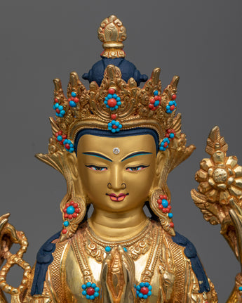 The Chenrezig statue is constructed on copper alloy and hand-carved with the utmost attention to detail. The statue is plated with genuine 24k gold. The compassionate being is depicted sitting on a double lotus seat with a calm expression. He holds a wish-fulfilling gem with his front two hands, and He carries a lotus flower in his other left hand and a crystal mala (rosary) in his right hand. He is wrapped with a beautifully hand-carved silk garment and a crown.