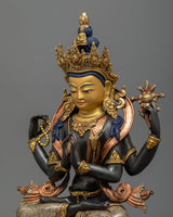 The timeless virtues of kindness and elegance are personified in our Chenrezig Statue. Carefully crafted and embellished with 24K gold This statue represents unending love and compassion. Its gilded brightness, gold, and acrylic paintings are accented by silver-plated parts on an oxidized copper body. Allow this statue to serve as your beacon of hope as you travel the path to spiritual awakening and inner serenity, regardless of your need for comfort or your desire to develop compassion in your life.
