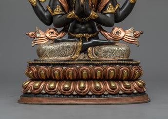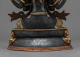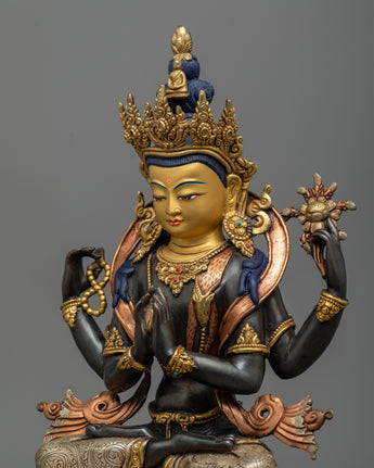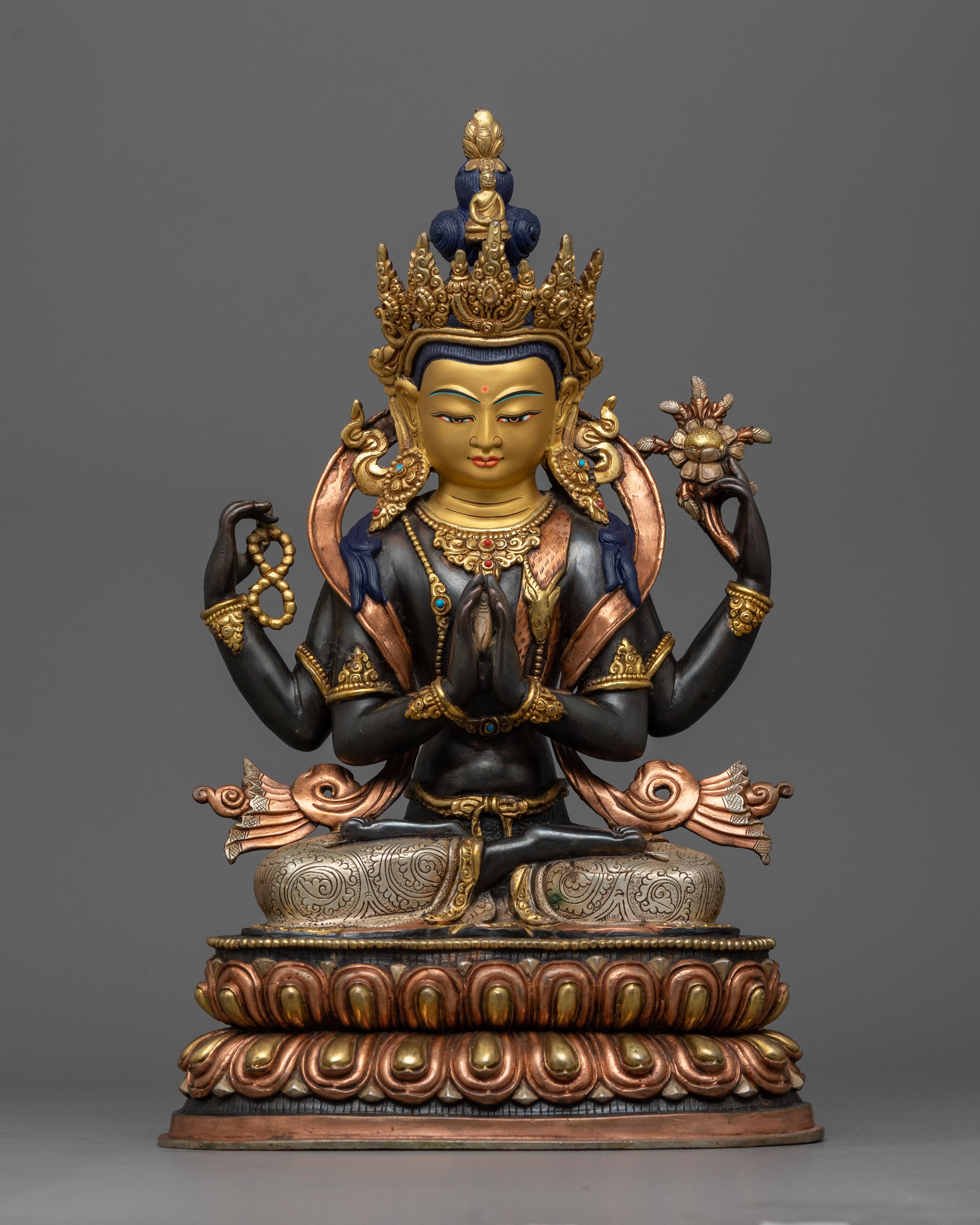 Our Chenrezig Karuna Bodhisattva Statue, with its serene grace, embodies the profound essence of compassion. This statue emanates a sense of divine peace and compassion. It was painstakingly crafted with beautiful attention to detail utilizing a combination of 24K Gold Gilded highlights, Gold & Acrylic Paintings, and Silver-Plated elements on an Oxidized Copper Body.