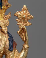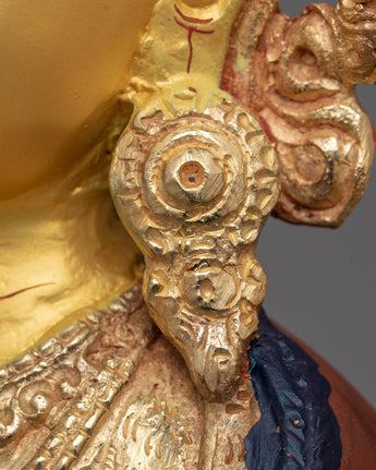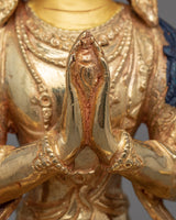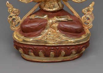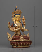 Our Chenrezig Lord of Kindness Statue, precisely sculpted to illuminate your spiritual journey, will transport you to a realm of compassion. This statue, which is 13 inches in height and 8.3 inches in base, emanates a sense of divine pity and benevolence. This statue was carefully thoroughly crafted using the best materials, such as copper that has been gilded in 24K gold and elaborately painted in both gold and acrylic. Chenrezig's enlightened energy is embodied in every aspect, from the calm countenance to the soft posture, which will lead you on a journey of spiritual development.