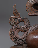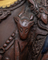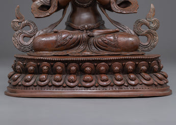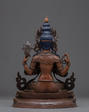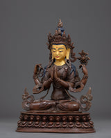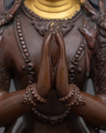 This Chenrezig Pure Land Prayer figurine was traditionally hand-crafted in our studio by skilled artisans from Nepal using complex design patterns. We used oxidized copper to construct the figure. The god is shown in this representation as having four arms, sitting on a moon disc lotus, and being subdued. The Deity grips rosary beads in his right hand, two of which are clasped in front of him in a gesture of prayer, the wish-fulfilling jewel, a flowering lotus in his left hand, and a wish-fulfilling crystal in his left hand. Hand-carved designed patterns are carved to adorn the figure, particularly on the crown, robe, and body jewelry. With real 24K gold, we have gilded the face of the Deity Chenrezig. As a devotee who regularly engages in disciplines like meditation and yoga, this Chenrezig figurine will be the ideal Nepali gift for someone like you.