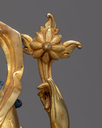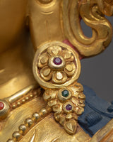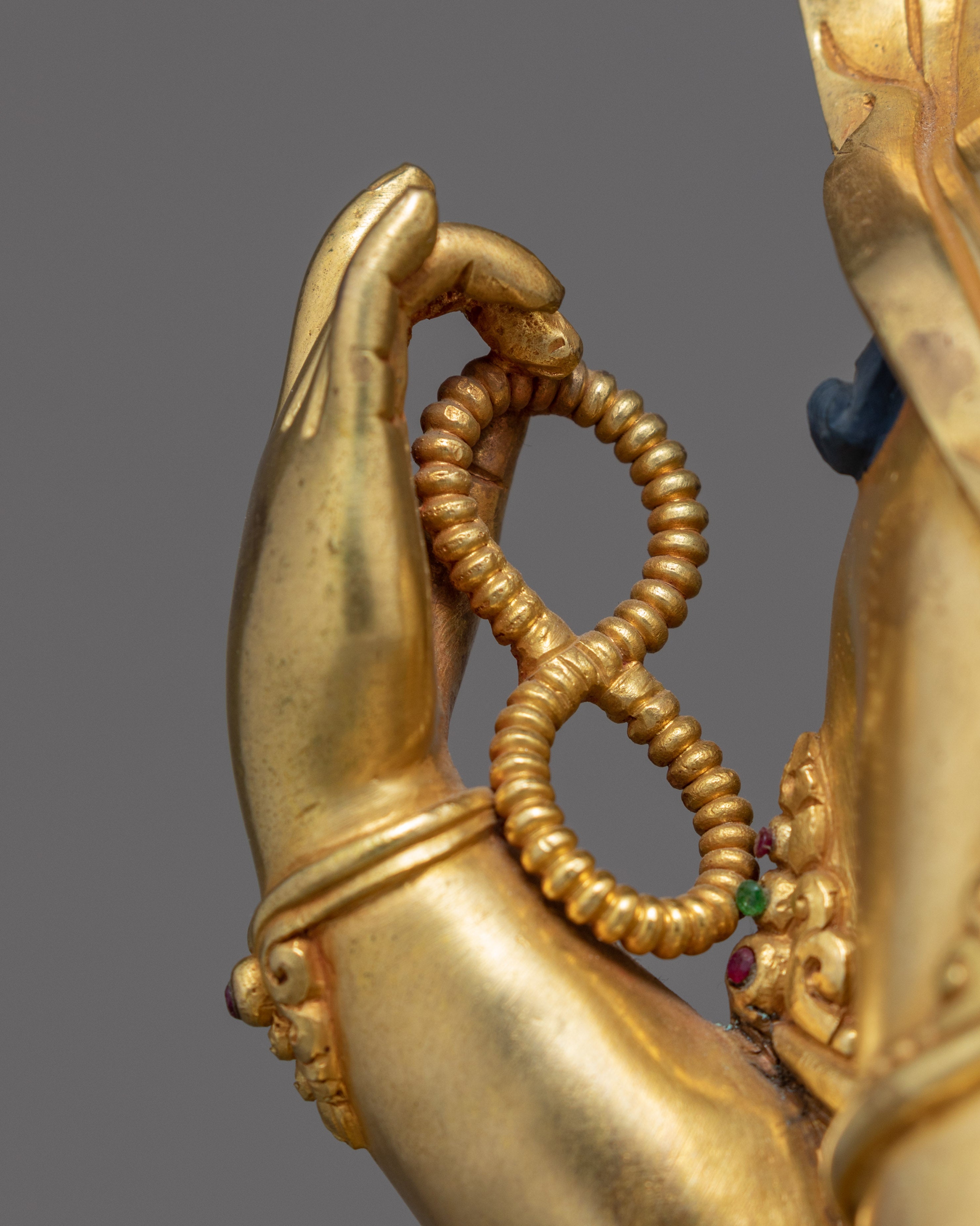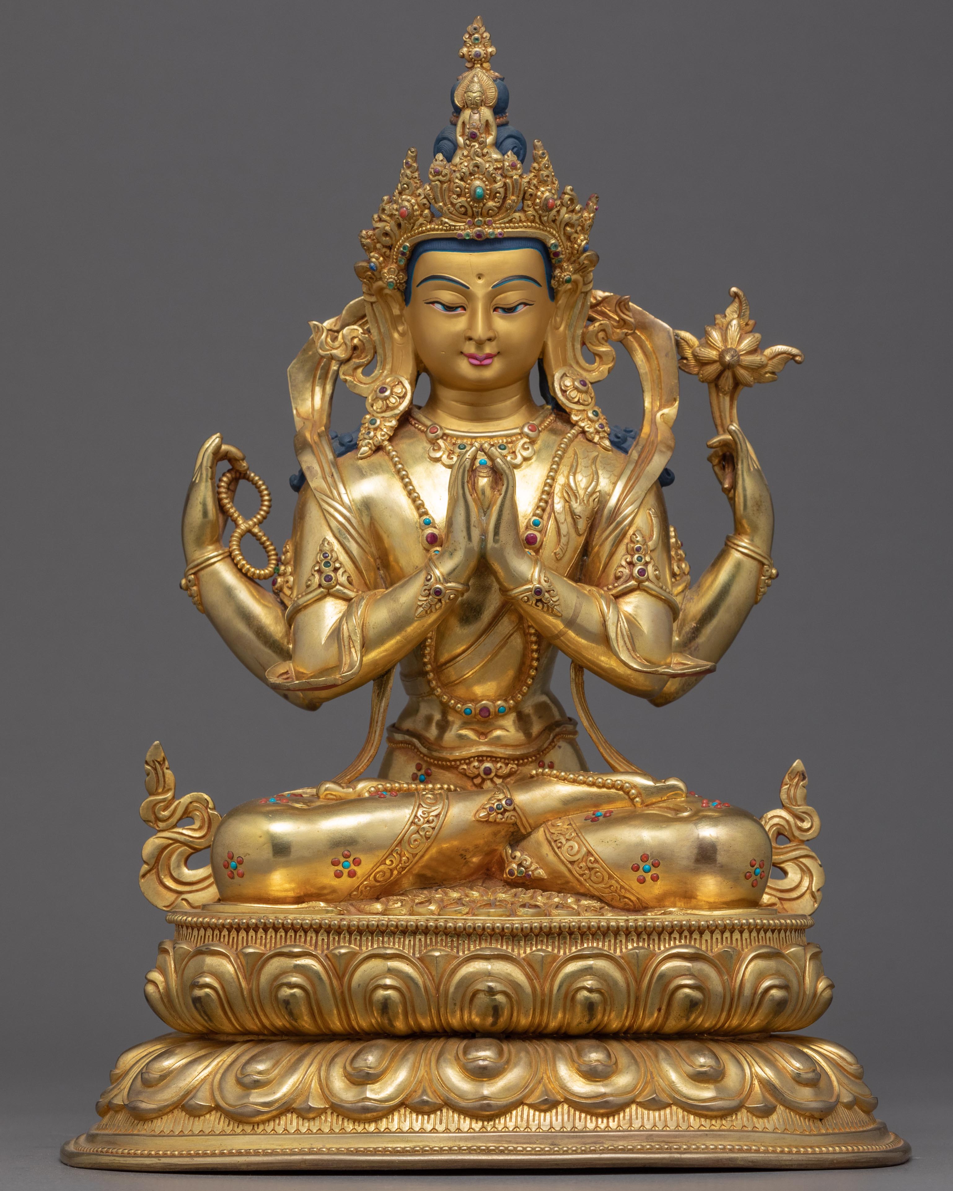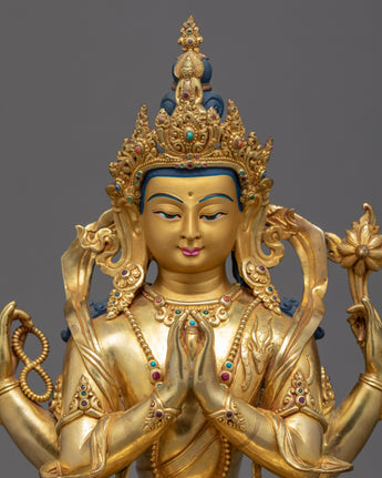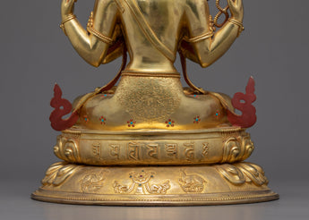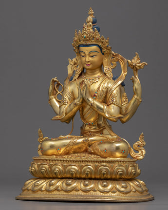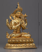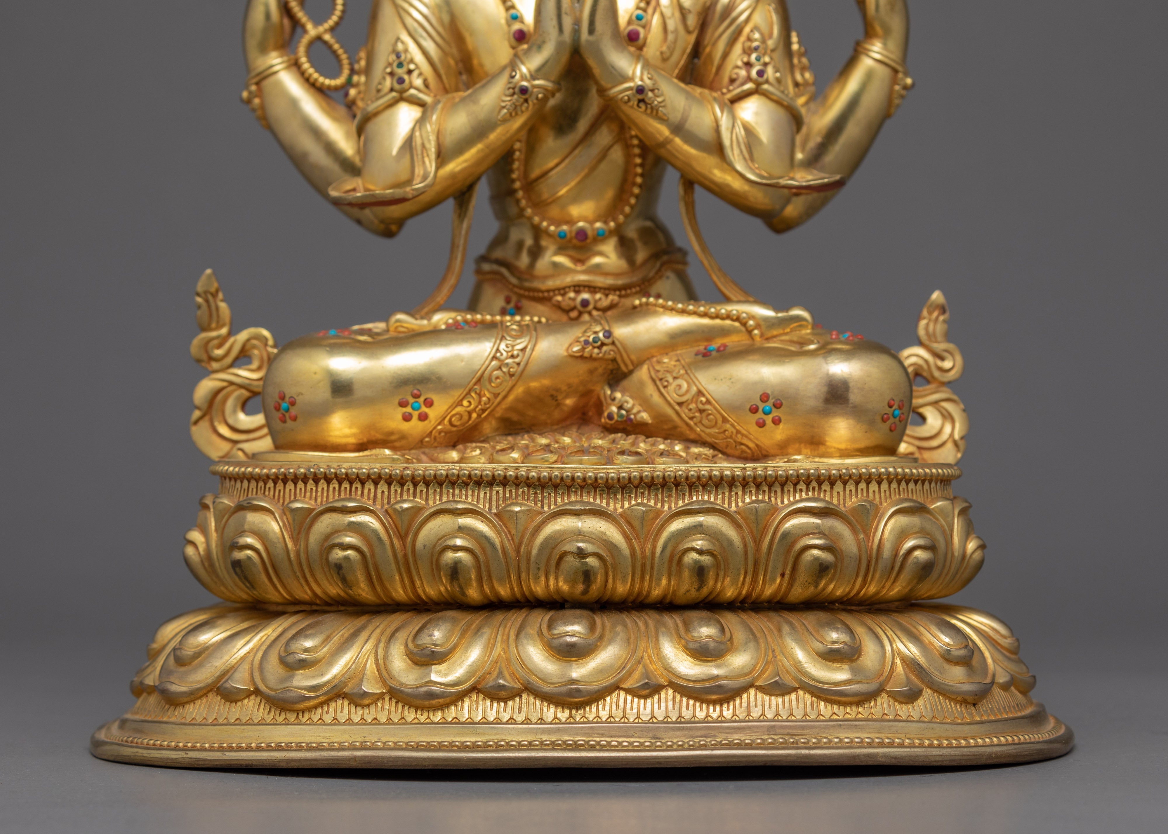 This traditionally crafted Chenrezig Tibetan Statue was crafted with the skillset passed down from generations while perfecting the art in our studio in Nepal. The statue was carved from a body of pure copper gilded with genuine 24k gold.Also known as Avalokitesvara, "One who looks with the unwavering eye" is the most revered of all Bodhisattva. The deity is depicted sitting atop a moon disc lotus with her two front arms folded together, holding a jewel-draped heart. His upper right-hand holds his special symbol, a crystal rosary, while his left-hand holds a white lotus. We worked tirelessly in our studio for several months to create this magnificent piece of art.