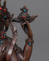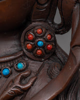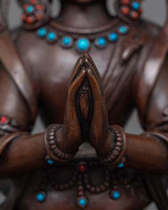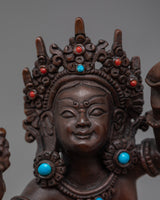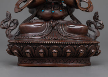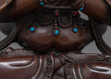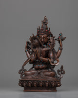 With the Chenrezig Yab-Yum Statue, you can welcome the harmonious energy of divine unity into your holy area. Flawlessly crafted with devotion and precision, this statue represents Chenrezig and his Consort in a tender embrace, signifying the Buddhist tradition's unification of compassion and wisdom. This statue, which is made of fine oxidized copper, is a potent reminder to practice harmony and compassion in your daily life.