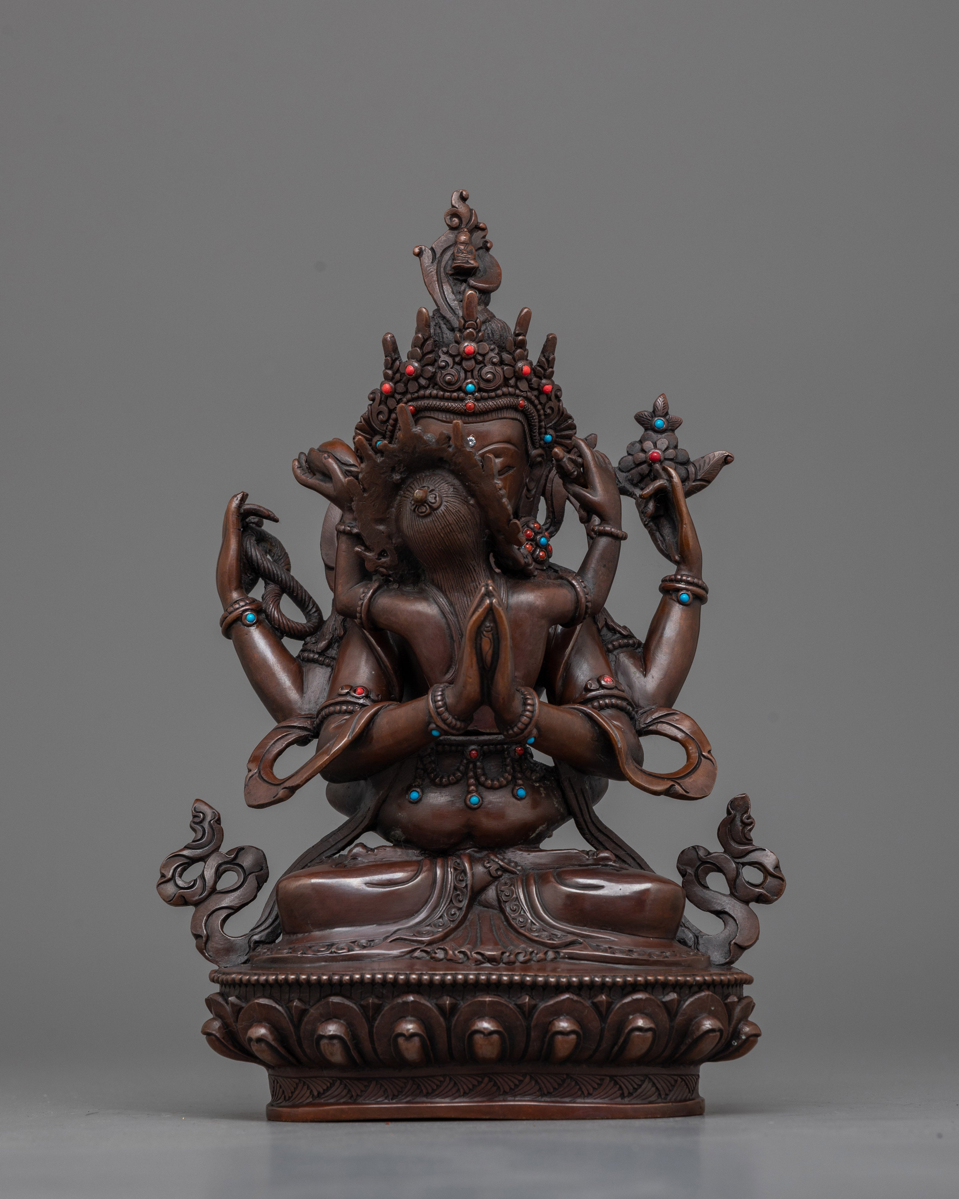 Chenrezig, also known as Avalokiteshvara, is the Buddhist deity who represents compassion. When shown with his consort, the image represents the harmonious combination of compassion (Chenrezig) and wisdom (Consort). They embody the essential principles of Buddhist teachings by teaching the significance of balancing compassion and wisdom. This statue reminds us of the connectivity of all things, as well as the heavenly dance of love and understanding.