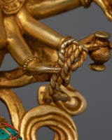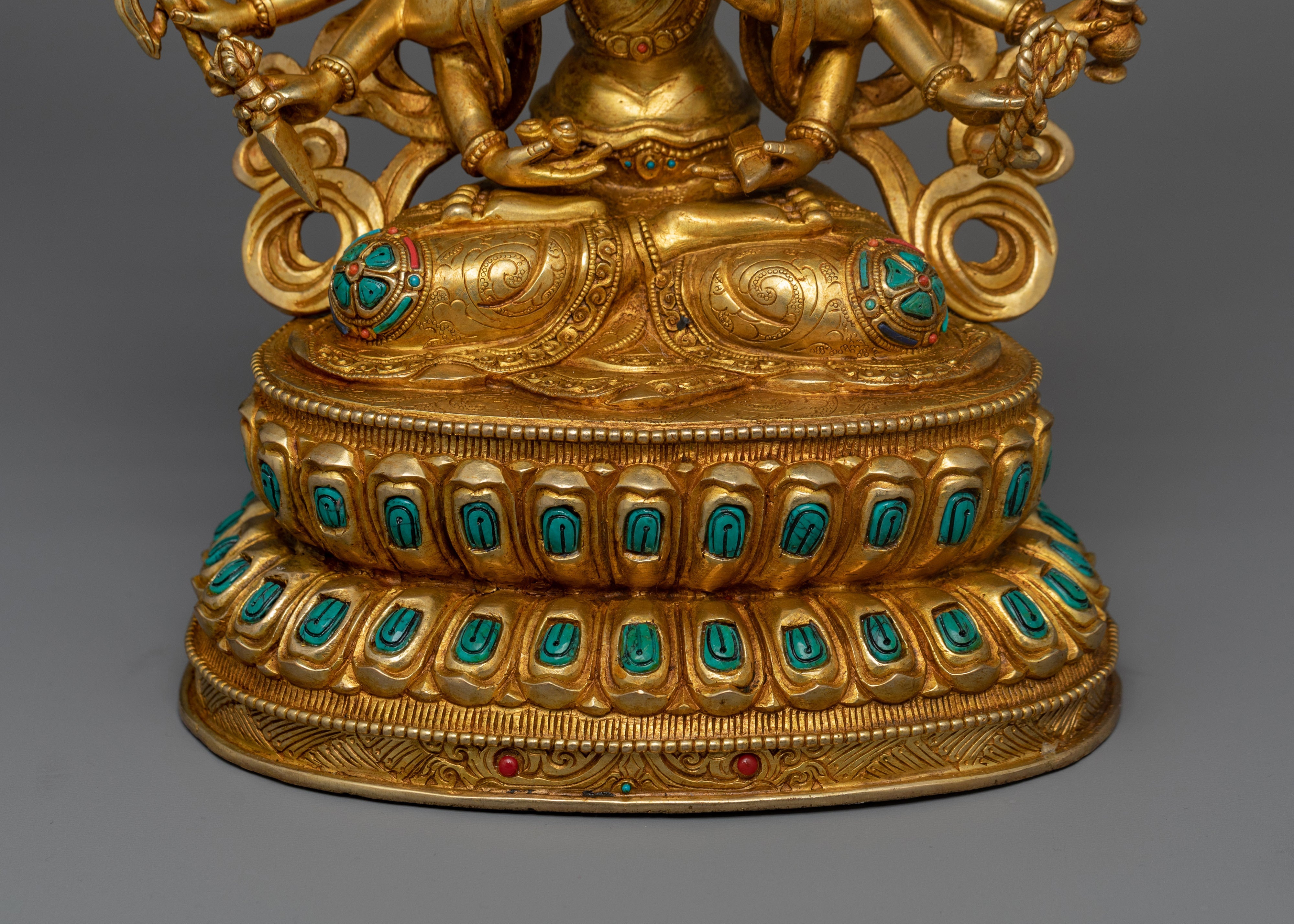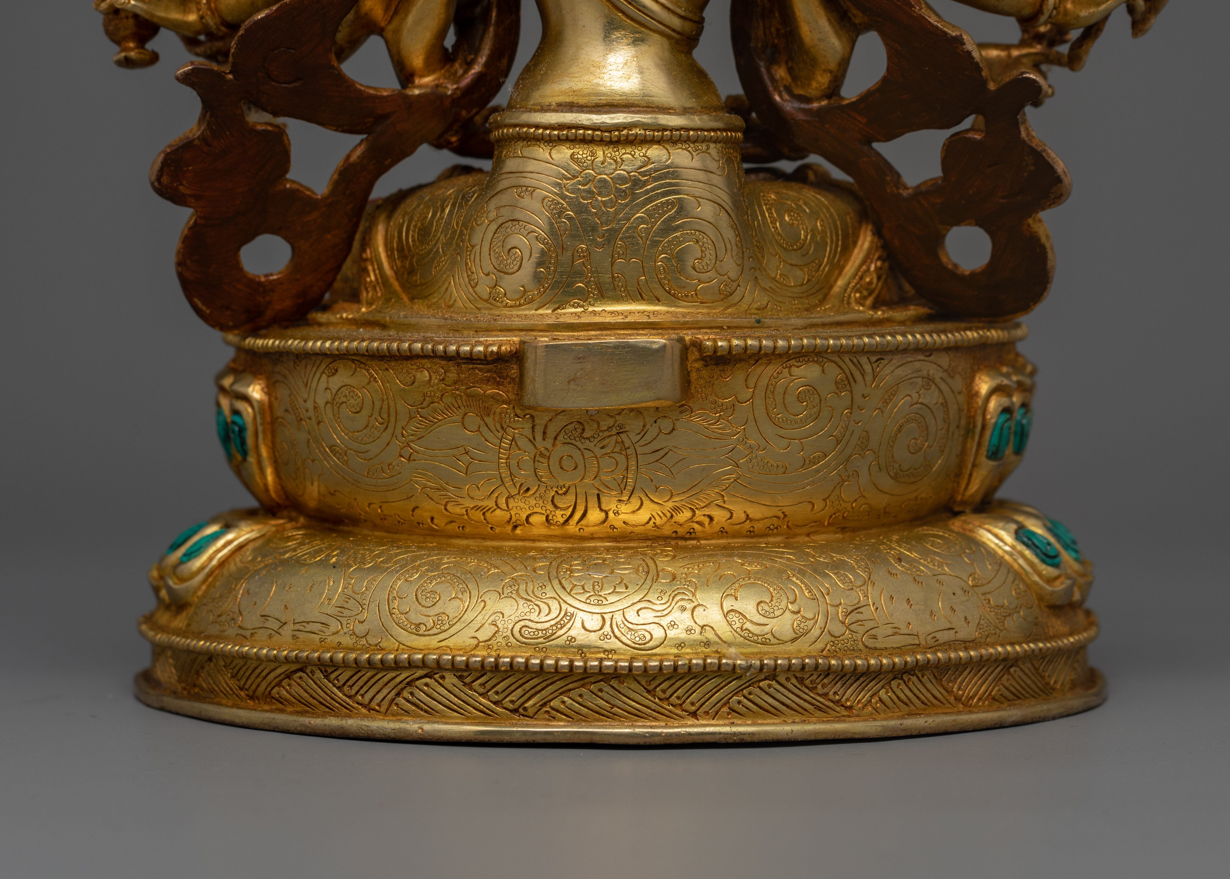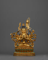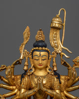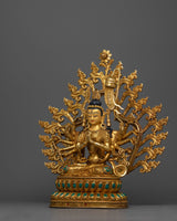This gorgeous Chundi Bodhisattva statue is a representation of divine protection and spiritual understanding. This copper statue is handcrafted with careful precision and features 24K gold plating and gold and acrylic paintwork. The bodhisattva's tranquil smile and many hands demonstrate her unlimited compassion and protective power, making her an excellent complement to any spiritual practice or sacred area.