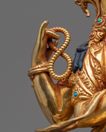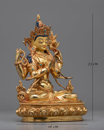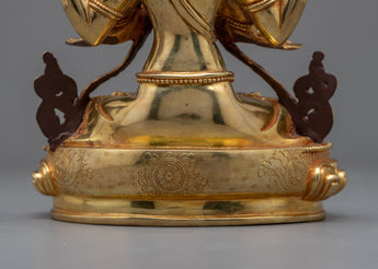 The Compassion Deity Chenresig Statue, which exudes heavenly compassion and mercy, will elevate your spiritual haven. This work of art has a copper body, 24K gold gilding, gold and acrylic paintings, and stands 9.1"/23 cm and weighs 2.14 kg. Chenresig, the Tibetan Buddhist deity of compassion, fills your environment with an infinite supply of love and kindness, encouraging you to develop compassion within yourself. Welcome the life-changing force of Chenrezig and follow the road of kindness and spiritual awareness. Accept Chenresig's teachings as you go out on a path of self-exploration and spiritual development, finding comfort and tranquility in the Bodhisattva's unbounded compassion.