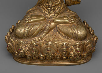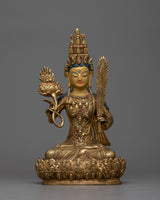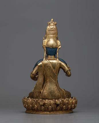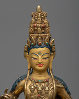The sculpture in the picture is a vivid, finely detailed depiction of a Buddhist deity, Akasagarbha Bodhisattva Statue that was made to capture the spiritual essence and imagery frequently connected to Tibetan Buddhism. The figure is perched on an elaborately designed pedestal with traditional themes and symbols, displaying a meditative stance. The god displays a composed yet dignified face, and his half-closed eyes allude to a profound state of concentration or introspection.