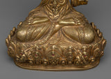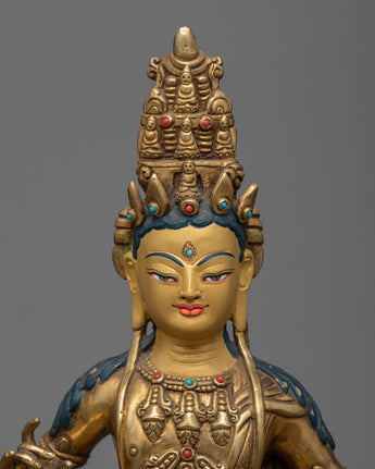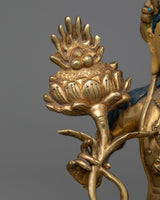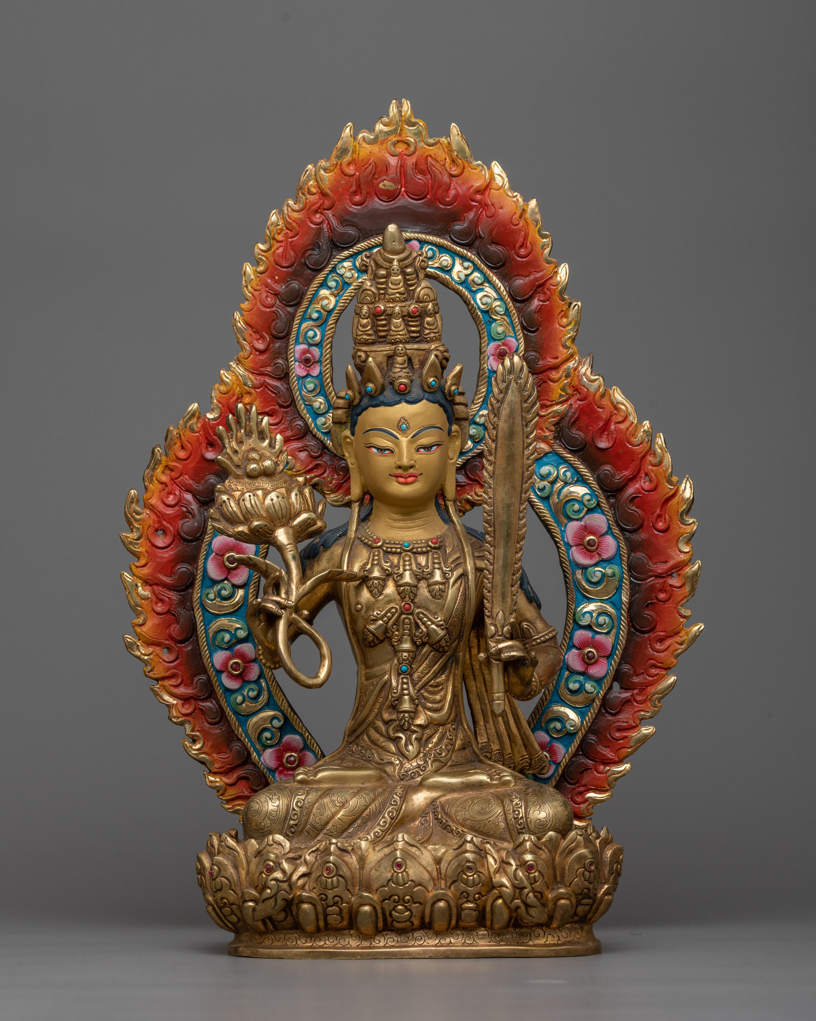 The deity, adorned with an intricate crown and numerous decorations, is wearing jewelry, signifying the figure's sacred and spiritual richness. The aura or halo around the deity is fiery and multicolored, suggesting the presence of divine energy and the transformation of ignorance into wisdom. The coloration, especially the use of gold, reds, and blues, is symbolic and highlights the figure's transcendent qualities. The craftsmanship suggests a high level of artistry, indicative of a sacred object intended for veneration and ritual use within a temple or a shrine.