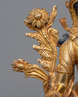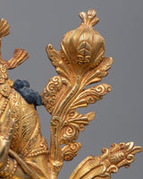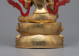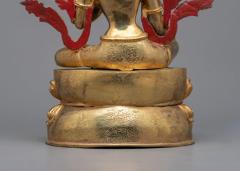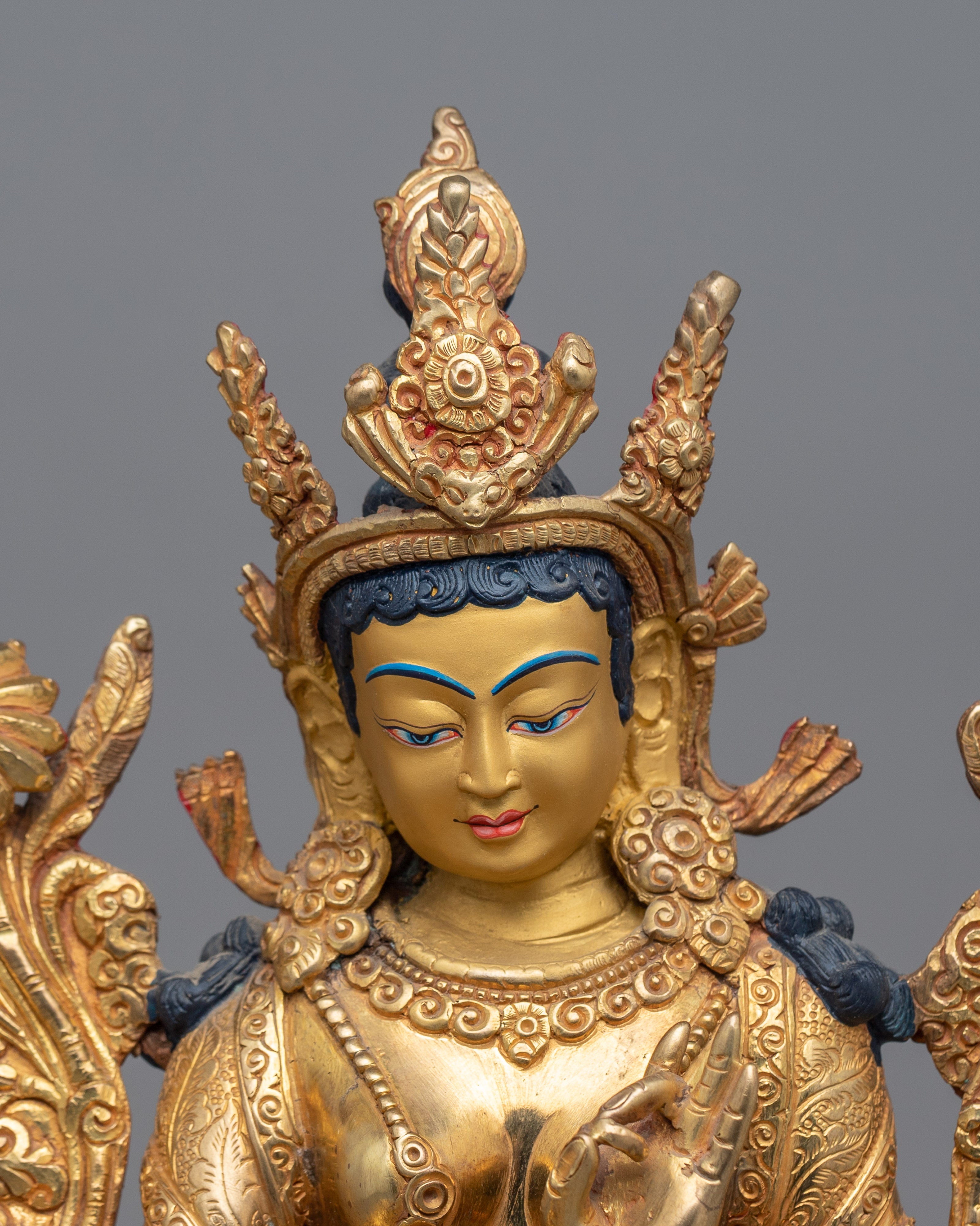 Presenting the Compassionate Green Tara Sculpture, a portrayal of the female Bodhisattva renowned for her prompt assistance to those in need. This sculpture, which is 13 inches tall and 9.4 inches wide at the base and weighs 4.5 kg, is expertly made of a copper body, gilded in 24K gold, and accented with paints in both gold and acrylic. It encapsulates the spirit of Green Tara's kindness, her willingness to assist all living things, and her close relationship with the natural environment.
