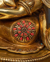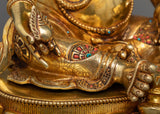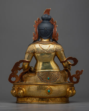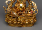 Dzambhala is renowned for his powerful capacity to eradicate poverty and financial hardships, directing followers toward a prosperous, kind, and moral path. The 24K gold gilding enhances the statue's divine allure, symbolizing the luminous wealth and abundance Dzambhala bestows upon those who seek his blessings. The intricate details and vibrant colors of the acrylic paintings bring depth and life to his dynamic posture and benevolent expression, inspiring confidence and gratitude in devotees.
