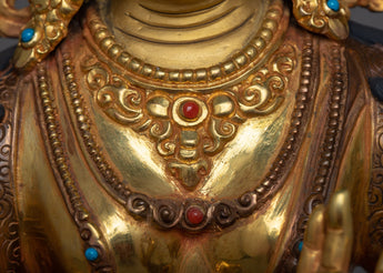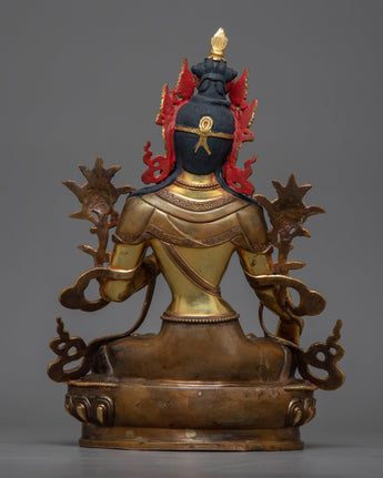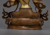 The oxidized copper body of the statue lends it a profound, timeless quality. It is then lavishly plated in 24K gold, highlighting White Tara's serene and compassionate countenance as well as the fine workmanship of her shape. The oxidized copper and gold gilding provide a beautiful contrast, emphasizing White Tara's tranquil yet powerful presence.