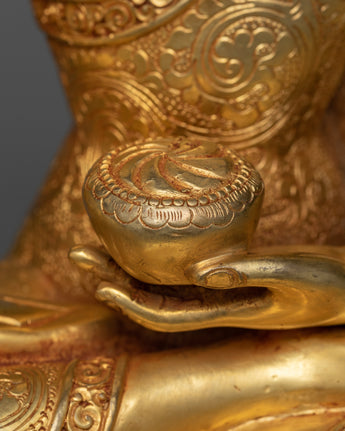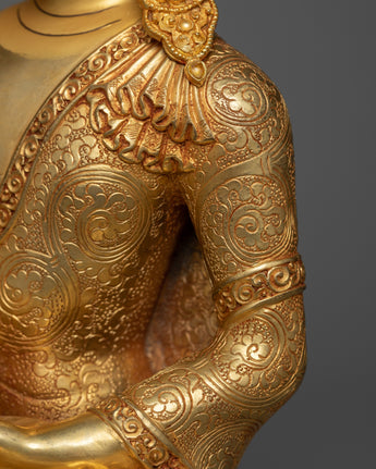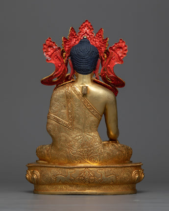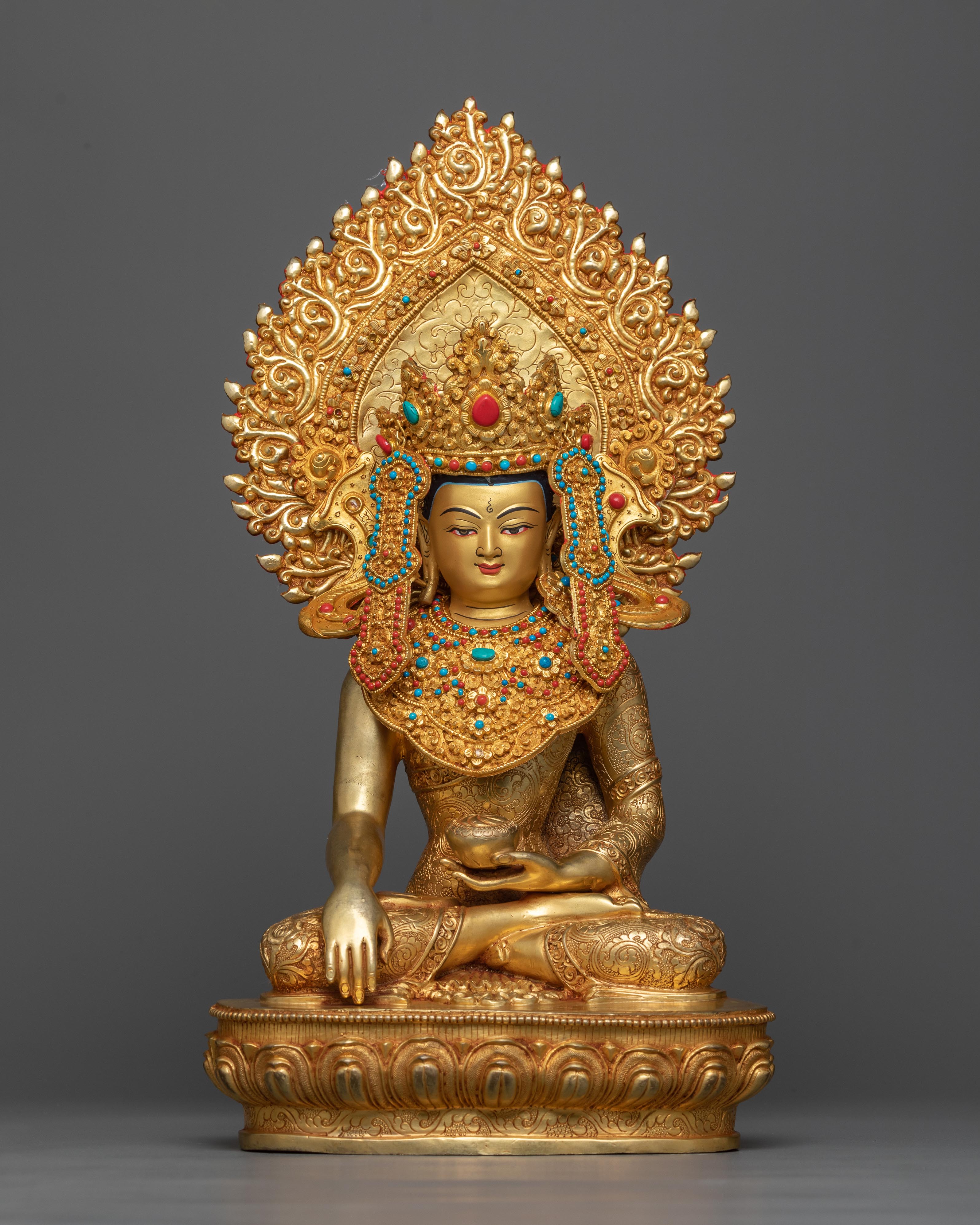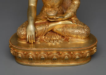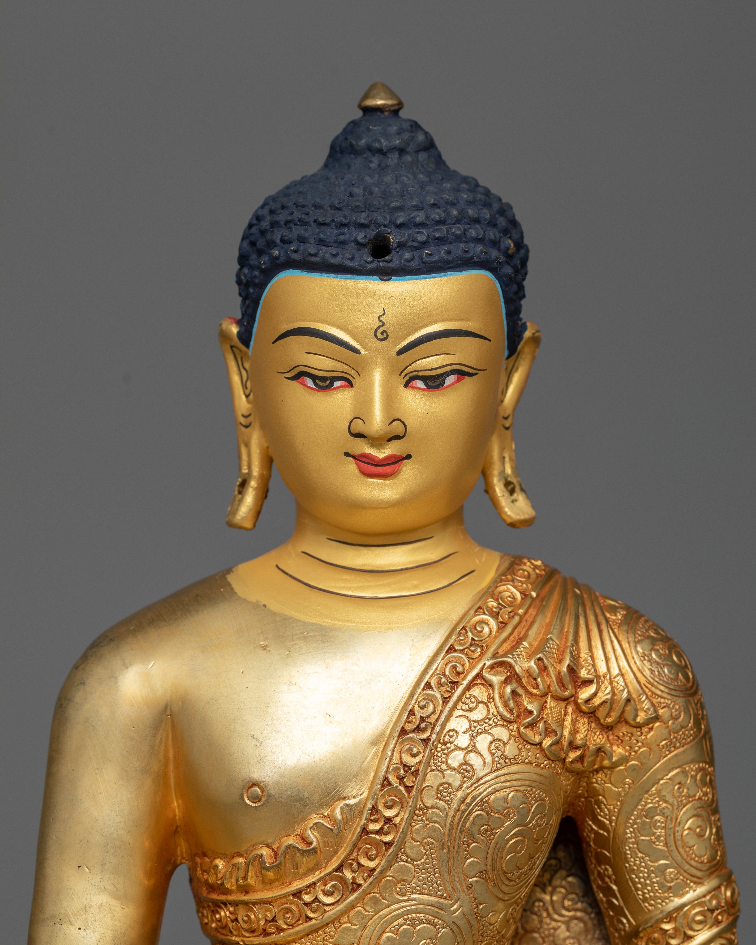 The Crown Buddha Shakyamuni Statue - will transport you to a world of spiritual splendor. This magnificent work stands 14.9 inches tall with an 8.2-inch base. This statue, made of copper and embellished with precise 24K gold gilding, gold, and acrylic paintings, represents enlightenment, inner calm, and spiritual wisdom.