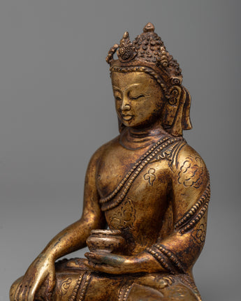 Our Crown Shakyamuni Buddha sculpture, an impressive blend of spiritual enlightenment and kingly grandeur, will grace your sanctuary. This statue, in the richness of antique 24k gold and set against the noble copper body, stands as a sign of Buddha's highest knowledge.