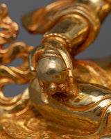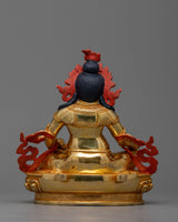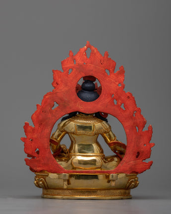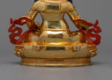 A magnificent representation of Dzambhala, the Buddhist god linked to money, prosperity, and removing hindrances to both material stability and spiritual advancement, is presented here: the Deity of Wealth, Dzambhala. This sculpture, which is 9.4 inches tall, rests on a 7.9-inch base, and weighs 2.37 kg, is proof of the skill and reverence that go into creating the figure of Dzambhala. Constructed with a copper body gilded in 24K gold and embellished with paintings in gold and acrylic, it embodies the magnanimous nature and formidable force of Dzambhala, mirroring his function as a guardian of prosperity and plenty.