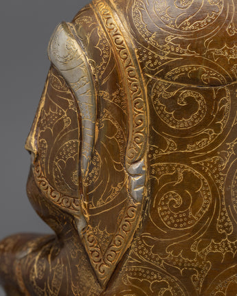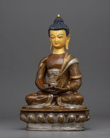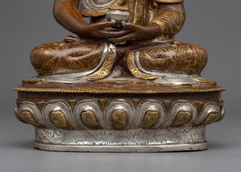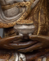 The Dhyani Buddha Amitabha statue is an intricately handcrafted piece produced in our studio and designed with unique Nepali motifs. The statue comprises full oxidized copper with intricate carvings done over the course of months. It is also partially gilded in gold, highlighted with acrylic colors, and plated in silver. The Buddha can be seen peacefully sitting upon a moon disc lotus with an alms bowl over his lap carried by his two hands, which are in the precise position of a 'Dhyan Mudra,' a characteristic hand gesture of Amitabha Buddha.