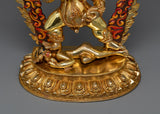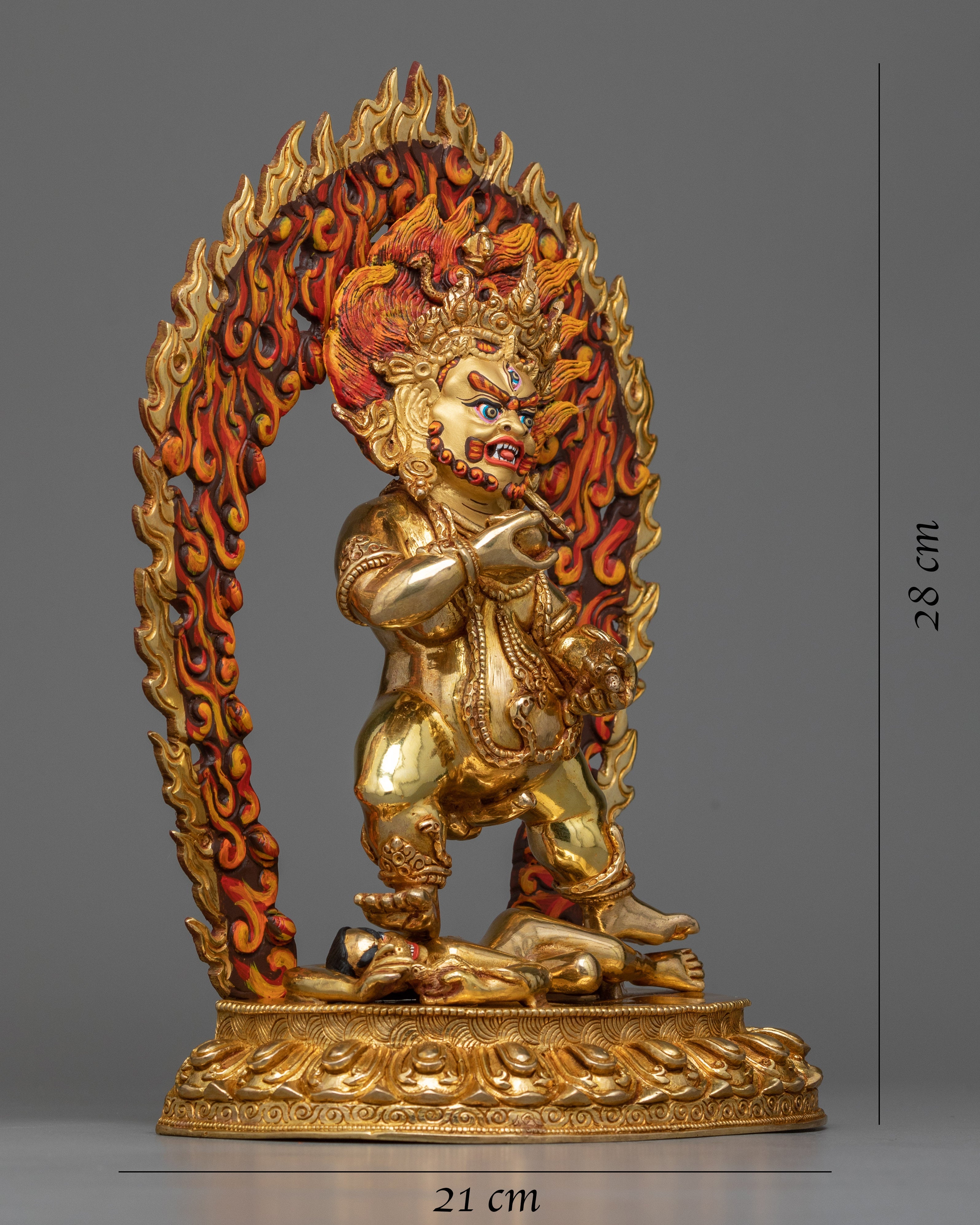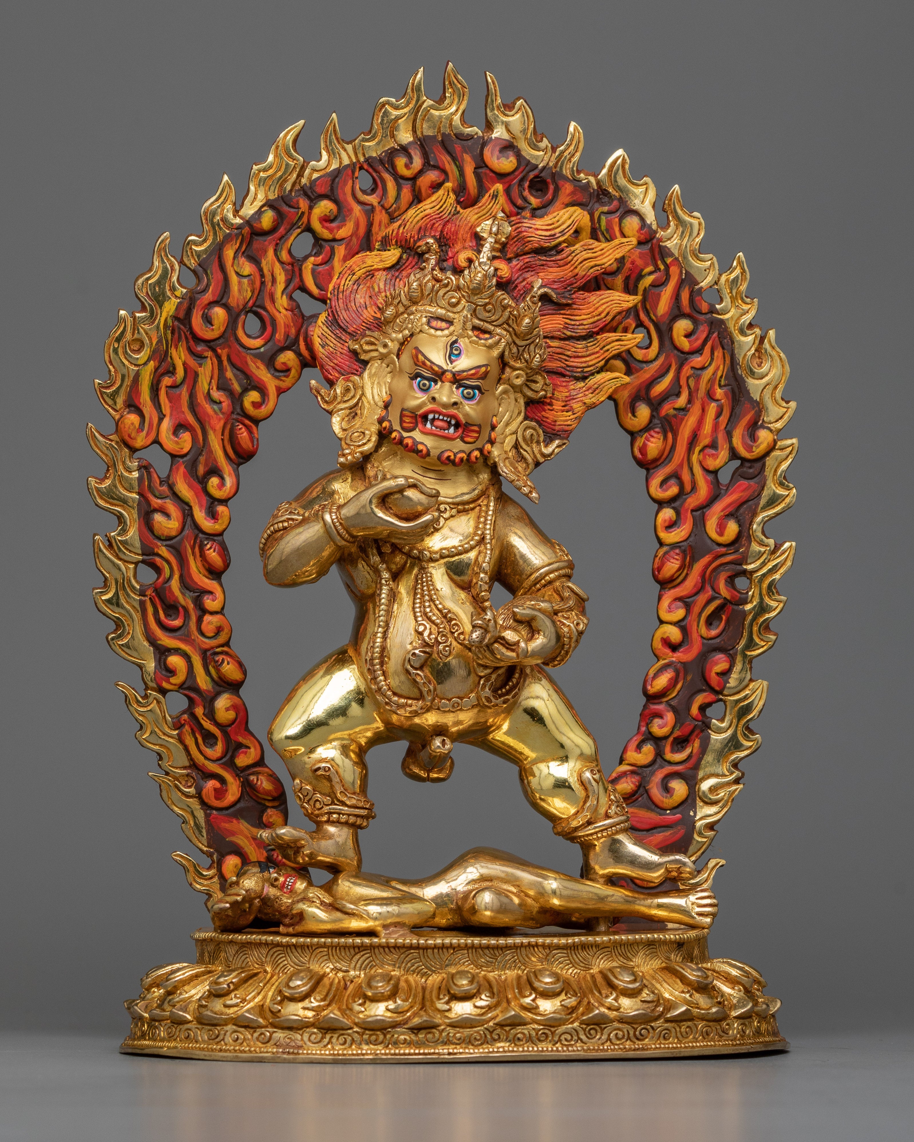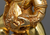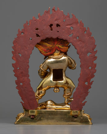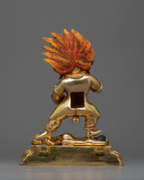 This Nagpo Jambala statue represents prosperity and financial stability. The wrathful countenance of the deity, combined with his regal posture, welcomes a sense of peace and abundance into your home. The copper base of the statue is delicately polished, adding to its everlasting beauty. Adding this piece to your collection, whether for meditation, yoga, or as a sophisticated home decor item, offers a connection to the rich tapestry of Buddhist tradition and symbolism. It serves as a daily reminder of the potential for prosperity and peace in one’s life.