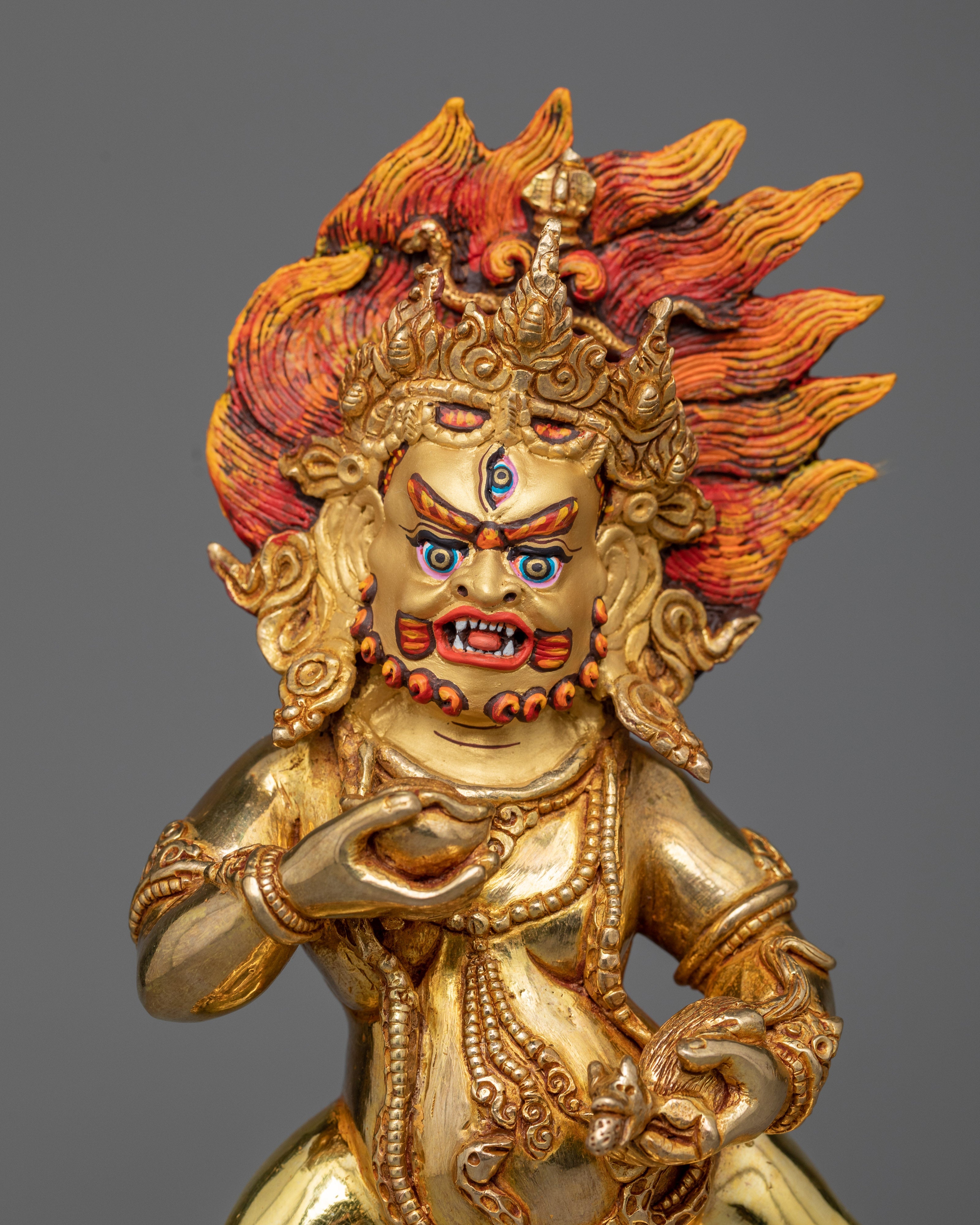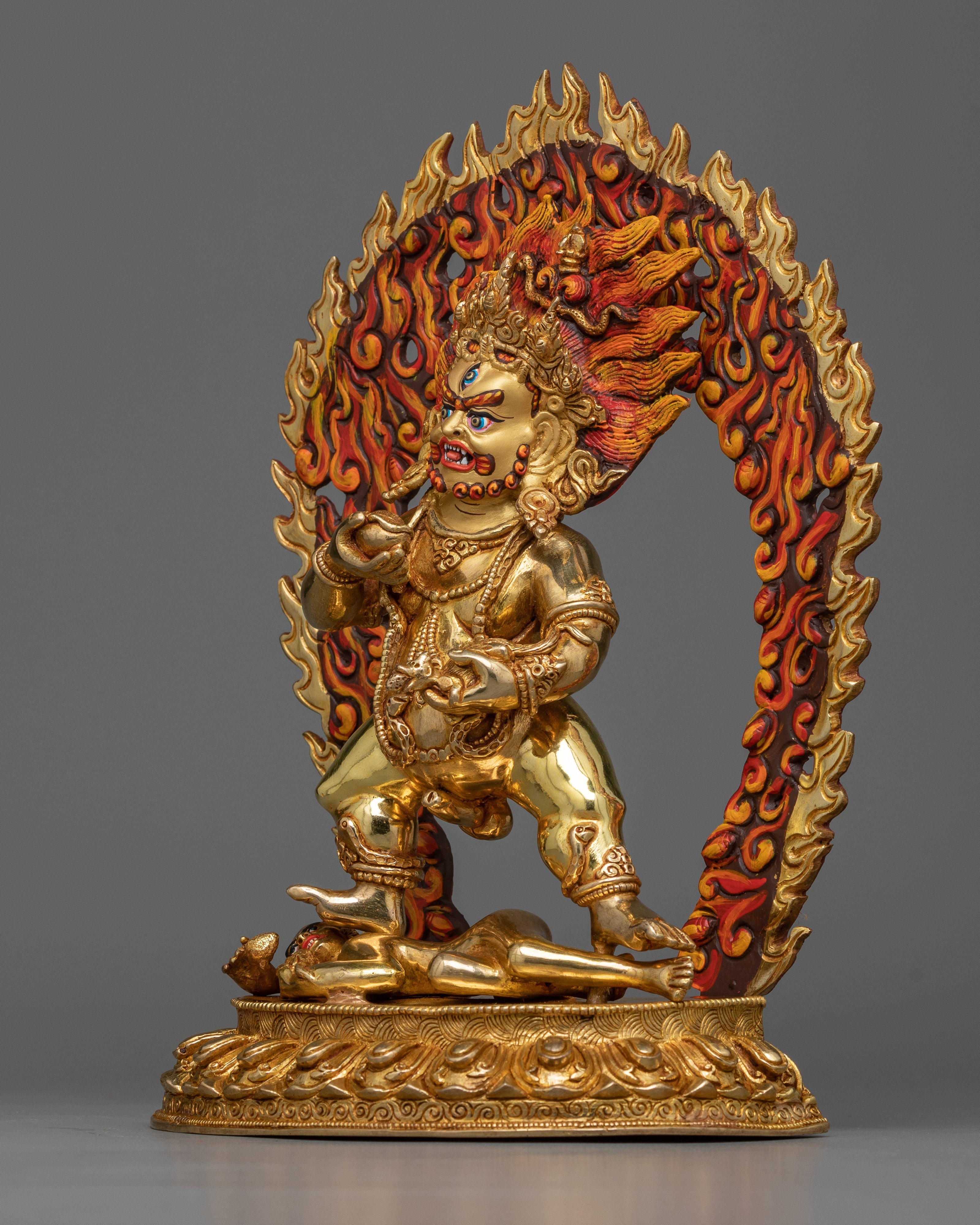 Nagpo Jambala is a manifestation of wealth and prosperity in the Buddhist tradition. He is frequently represented in a majestic shape, representing material and spiritual riches. Nagpo Jambala, as a wealth guardian, promotes not only financial security but also kindness and ethical behavior. His presence in Buddhist practice serves as a reminder of the importance of balancing material wealth and spiritual well-being, instructing practitioners to seek prosperity with compassion and openness.