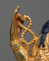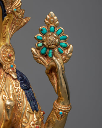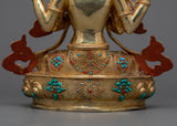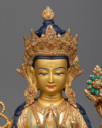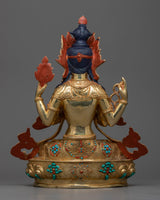 This stunning item is built around a copper body that has been skillfully handcrafted and gilded with 24K gold, expressing Chenrezig's purity and divine nature. The gold gilding, a symbol of the statue's spiritual essence, highlights every detail, from the soft look to the symbolic motions of the four arms, each holding a symbol of Chenrezig's caring vows.