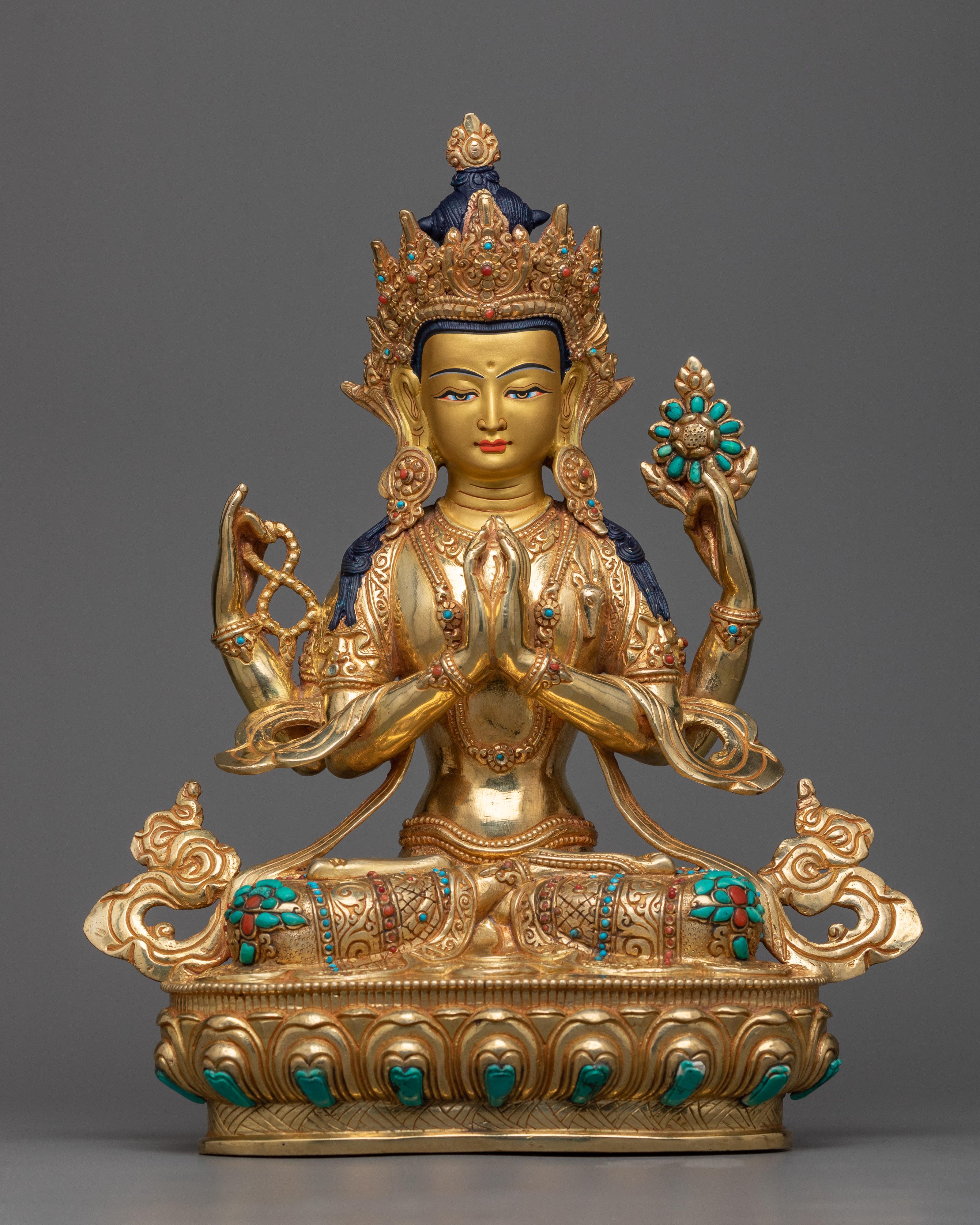 Divine 4-Arm Chenrezig Gold Gilded Statue | Embodiment of Compassion