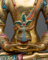 Crafted with precision from a copper body, this statue is gilded in a brilliant layer of 24K gold, signifying Amitayus's celestial vitality and purity. The gold gilding enhances the sculpture's delicate features, such as Amitayus' calm look and the luxurious textures of his robes—each fold of which is painted with gold and acrylic to accentuate the deity's vibrancy and sacredness. Amitayus, known for holding the vase of immortality, is a deity revered across Buddhist traditions for his association with increasing lifespan, enhancing health, and promoting meditative concentration. The Divine Amitayus Statue is a stunning piece of spiritual art and a meditative aid, inviting practitioners to reflect on the preciousness of life and the path toward enlightenment.