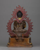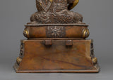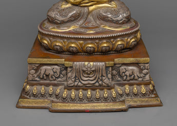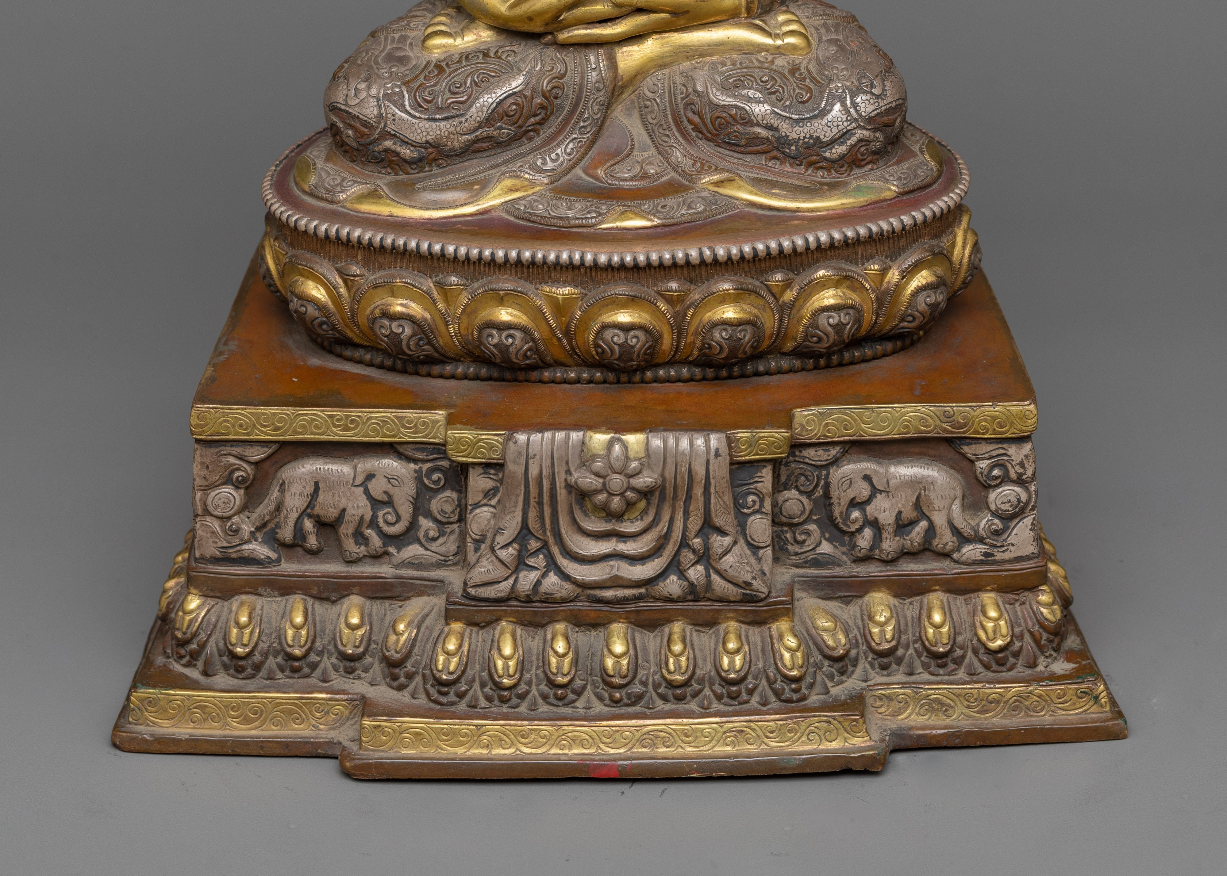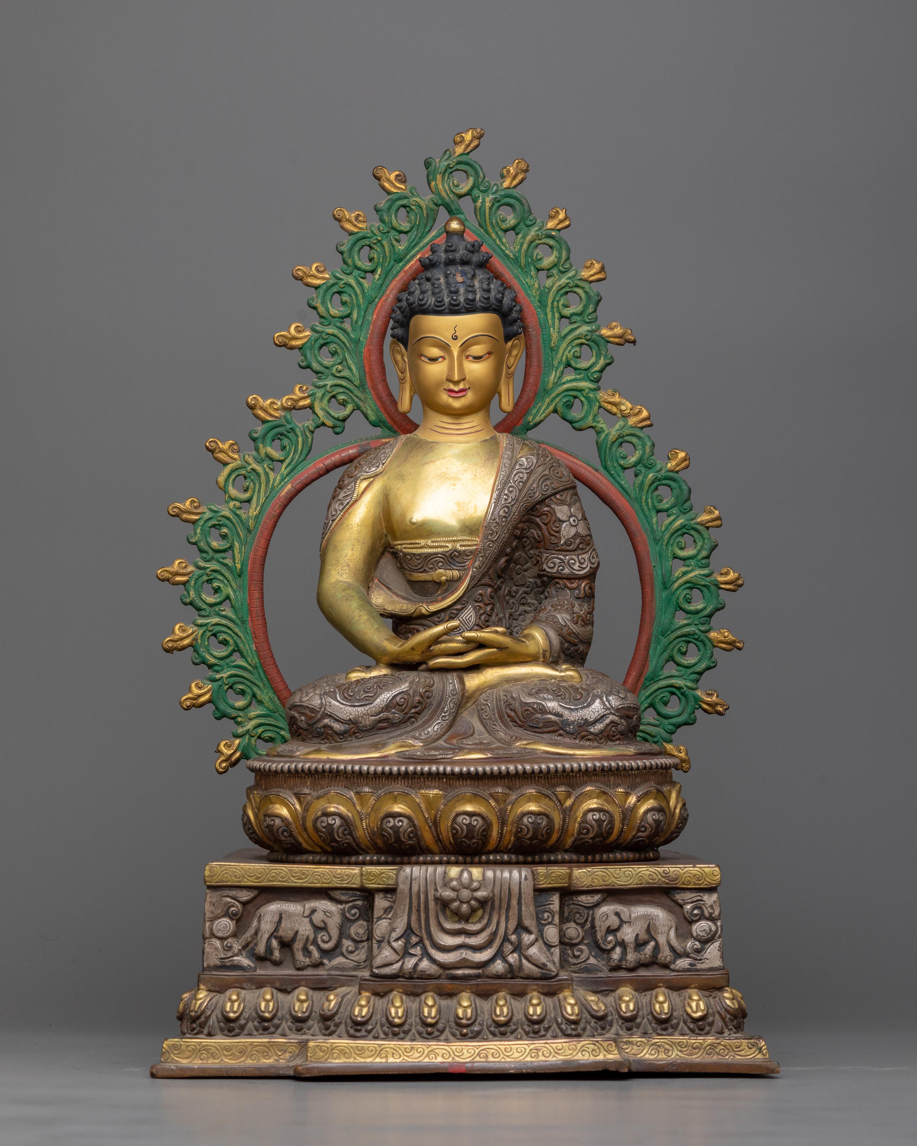 Immerse yourself in our Buddha Amitabha sculpture, which embodies the infinite knowledge and calm of Amitabha Buddha. This statue, richly embellished with 24K gold gilding, silver plating, and detailed with gold and acrylic paintings, is a masterpiece of Nepalese craftsmanship created by the acclaimed artisans of Patan. The use of oxidized copper as the core material gives profound depth and texture, signifying Amitabha's teachings' enduring power.