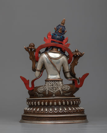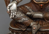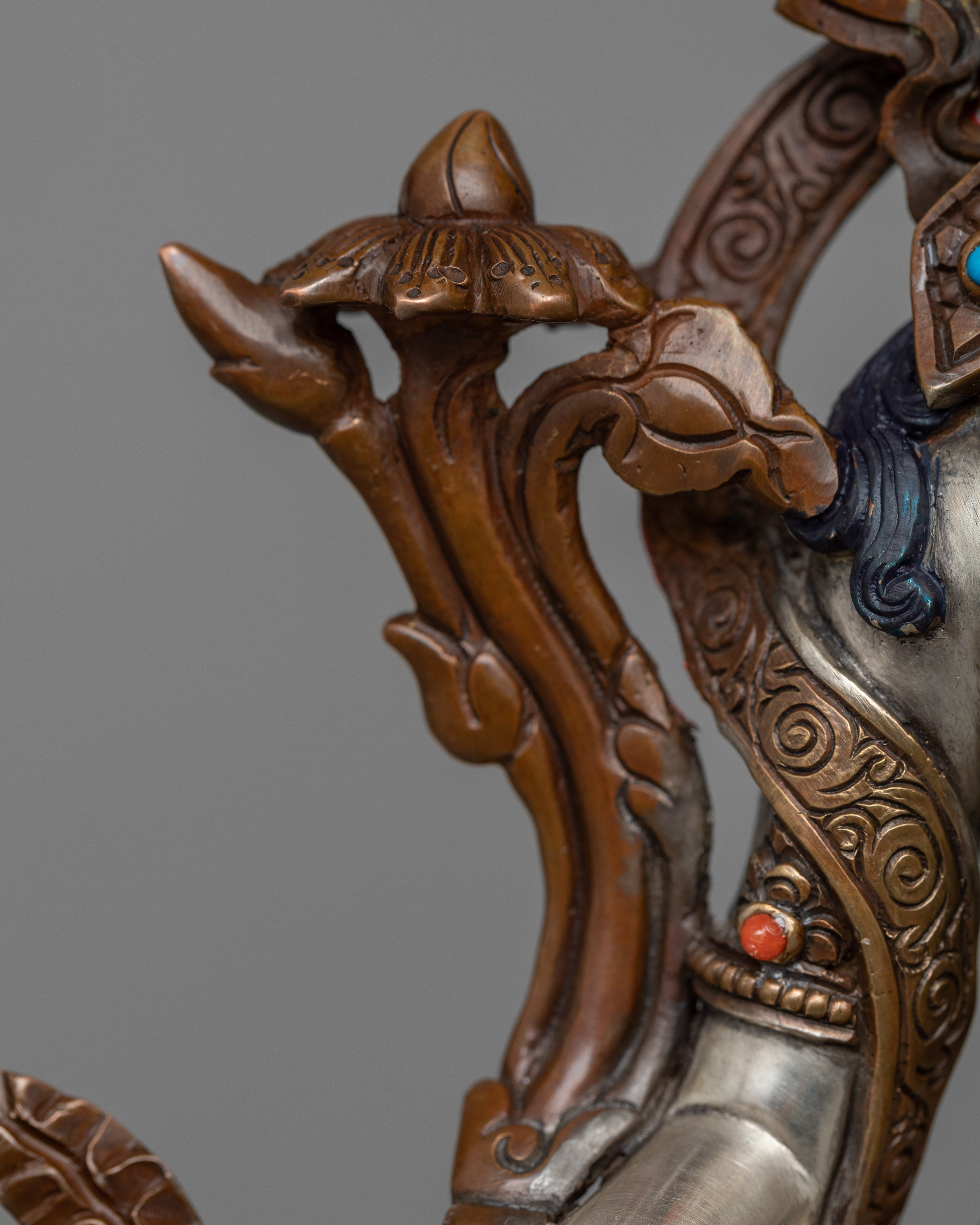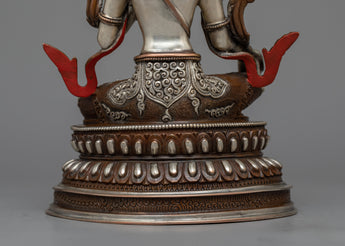 Accept the loving embrace of the Divine Green Tara Handmade Sculpture, depicting the swift-moving, deeply compassionate female Bodhisattva. This sculpture is a work of dedication painstakingly made by hand with spiritual meaning. The gold and acrylic paintings that cover this revered figure, each detail expressing Green Tara's pledge of protection and guidance, are painted on a silver-plated, oxidized copper body.