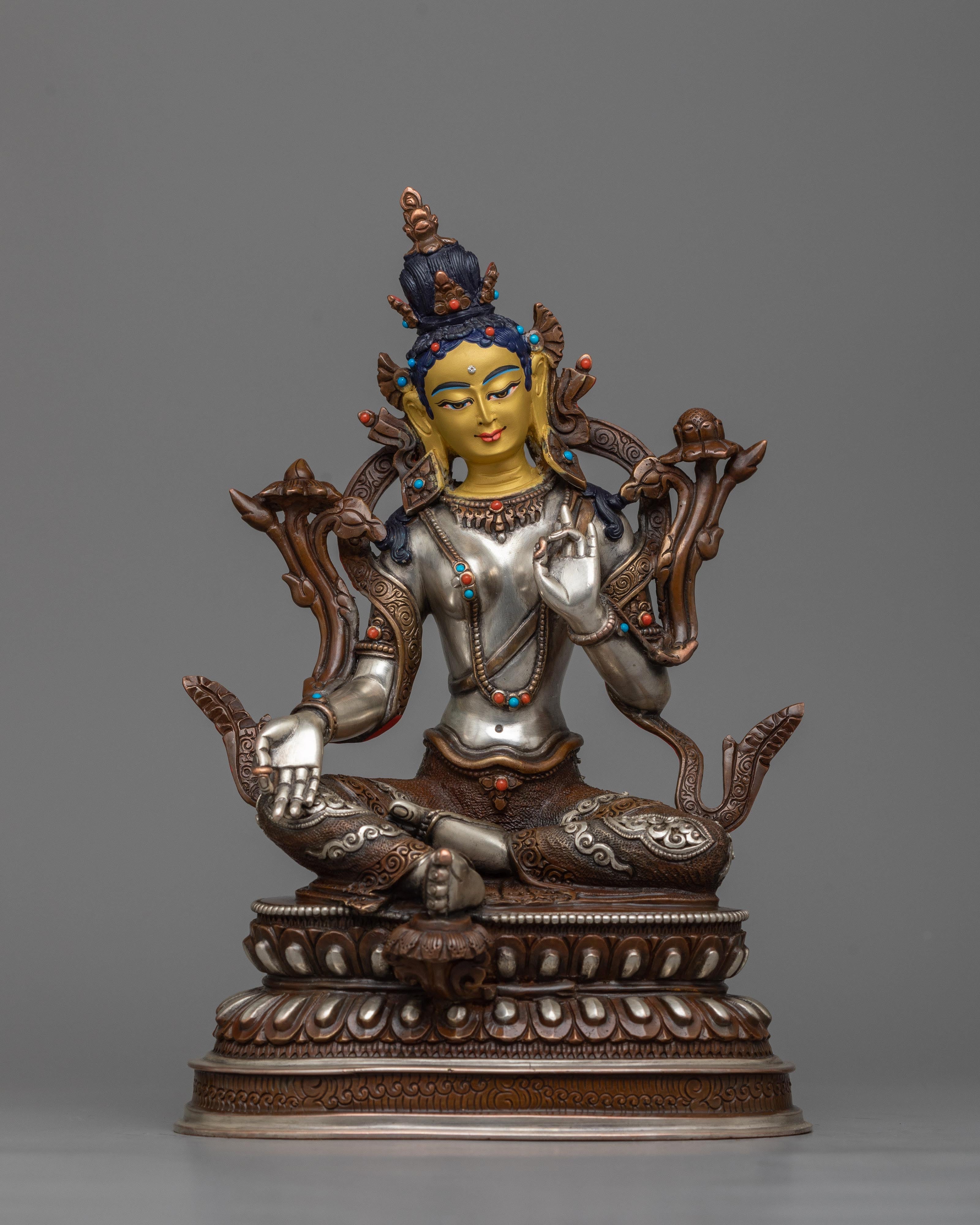 Green Tara, shown sitting elegantly with one foot outstretched, represents the proactive side of compassion in the world, poised to spring to the help of people who call upon her. Her calm demeanor, flowing robes, and blossoming lotuses are exquisitely detailed, signifying her purity and ability to face anxieties and challenges head-on.