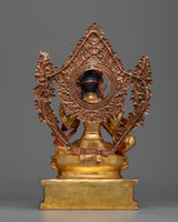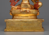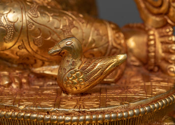 This sculpture, made of high-quality copper and gilded in 24K gold, is a work of art by Nepalese artisans. The gold and acrylic paints enhance Goddess Saraswati's ethereal beauty, highlighting her tranquil grace and profound wisdom. This statue's finely calibrated size and weight make it an ideal addition to any environment, instilling tranquility and inspiration.