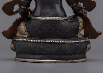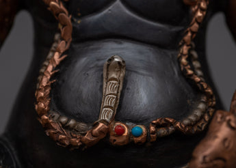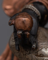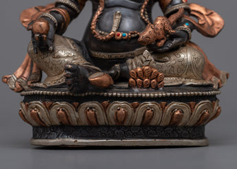 With our little yet attractive Djambala statue, you may invite fortune into your life. This 1.81 kg sculpture, which is 8.8" tall with a 6.4" base, embodies the majesty of Dzambala, the Buddhist god of riches. This statue was created by skilled Nepalese artisans and had an oxidized copper body with silver plating. The elaborate hand-carved embellishments decorating the robes and body jewelry demonstrate the artisan's dedication to accuracy. The face is illuminated by a covering of gold powder, and vivid acrylic paints highlight the expressive features.