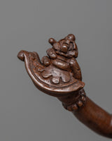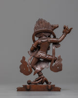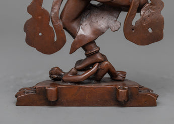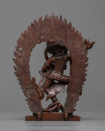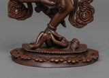 This monument depicts Dorje Phagmo in her trademark wrathful form, wielding a kartika (flaying knife) and a kapala (skull cup), signifying the abolition of ego-clinging and the devouring of obstacles on the path to liberation. Her stance and expression embody the power and determination characteristic of her teachings, offering guidance and protection to practitioners. The oxidized copper lends a timeless quality to the sculpture, emphasizing the enduring nature of Dorje Phagmo's strength and wisdom.