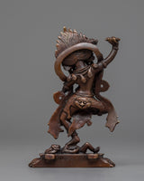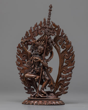 Hand-carved Buddhist by skilled Vajrayana artists in our studio, this Dorje Phagmo statue is a stunning representation of the female deity. This statue is made of oxidized copper, giving it a classic elegant appearance. The deity is depicted standing atop a sun-disc lotus seat upon a human figure representing the triumph of good over evil. She is holding various objects symbolic of her divinity as the fiery motifs surround her, adding to her wrathful appearance.