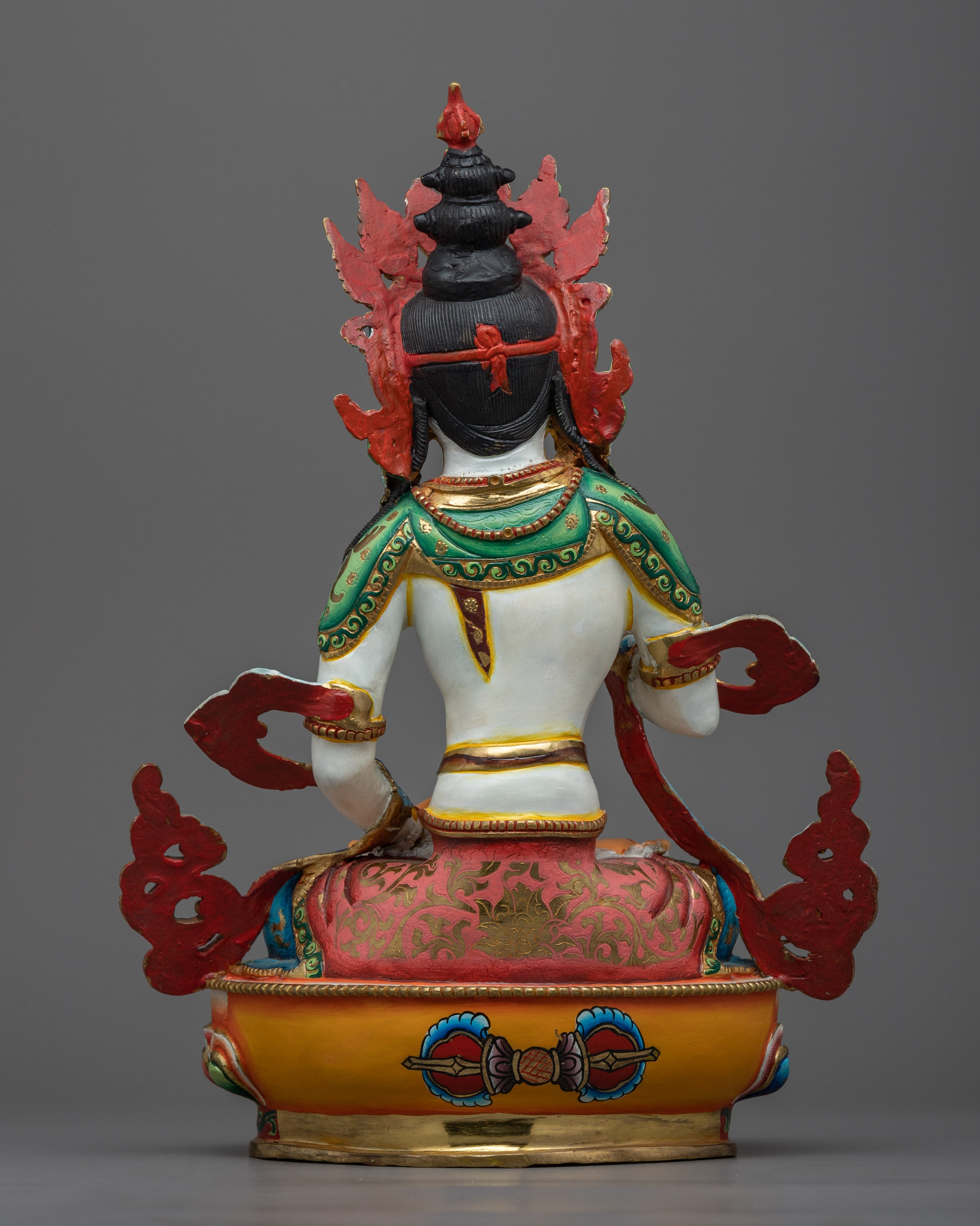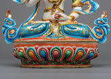 The Dorsem Vajrasattva Statue stands 12.9 inches tall and represents purity and spiritual transformation. Weighing 2.54 kg, this statue captures the essence of Dorsem Vajrasattva's cleansing energy with a copper body and careful 24K gold gilding. The body is painted white, indicating Vajrasattva's intrinsic purity, while the face is painted in actual gold, reflecting the heavenly glow of enlightened compassion.