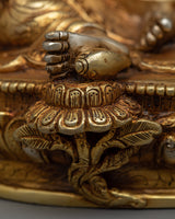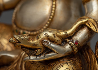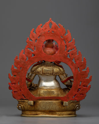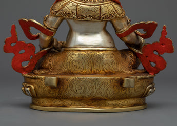 The 24k gold plating on the Dzambhala Kuber Murti is enhanced with exquisite gold and acrylic paints. This perfect combination of colors provides a spectacular sight, elevating this piece beyond the status of a statue to that of an image of tranquillity, wealth, and spirituality. The statue's significant weight reflects its substance and solidity, making it an extraordinary addition to your shrine, meditation room or as an impactful element of your home decor.