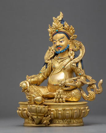 We have magnificently hand-carved the sculpture of Dzambhala or Jambhala in the traditional Himalayan Art of Nepal. We have used genuine 24k gold for gilding the statue, hand-carved in pure copper body and painted in acrylic colors. The deity depicted on the top of a sun disc lotus seat is exquisitely mesmerizing, which took more than a month for us to design and deft it. We have elegantly crafted the crown and adorned it with precious embellishments. You can use this art in different Vajrayana practices and in your regular meditational activities. We have portrayed the deity with a wrathful expression, holding a citron fruit in his right hand while he holds a mongoose in his left hand.