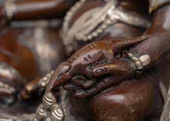Intricately handcrafted in our workshop, this traditional Dzambhala statue is full of unique Himalayan artistry. The statue depicts the Buddhist deity of wealth and good fortune sitting on a moon disc lotus seat. He can be seen holding a jewel-spitting mongoose in his right hand and a citron fruit in his left, signifying his ability to provide wealth. The statue is made out of oxidized copper and partially gilded in silver. The statue is full of intricate patterns and motifs that our artists carved out over the course of several months.